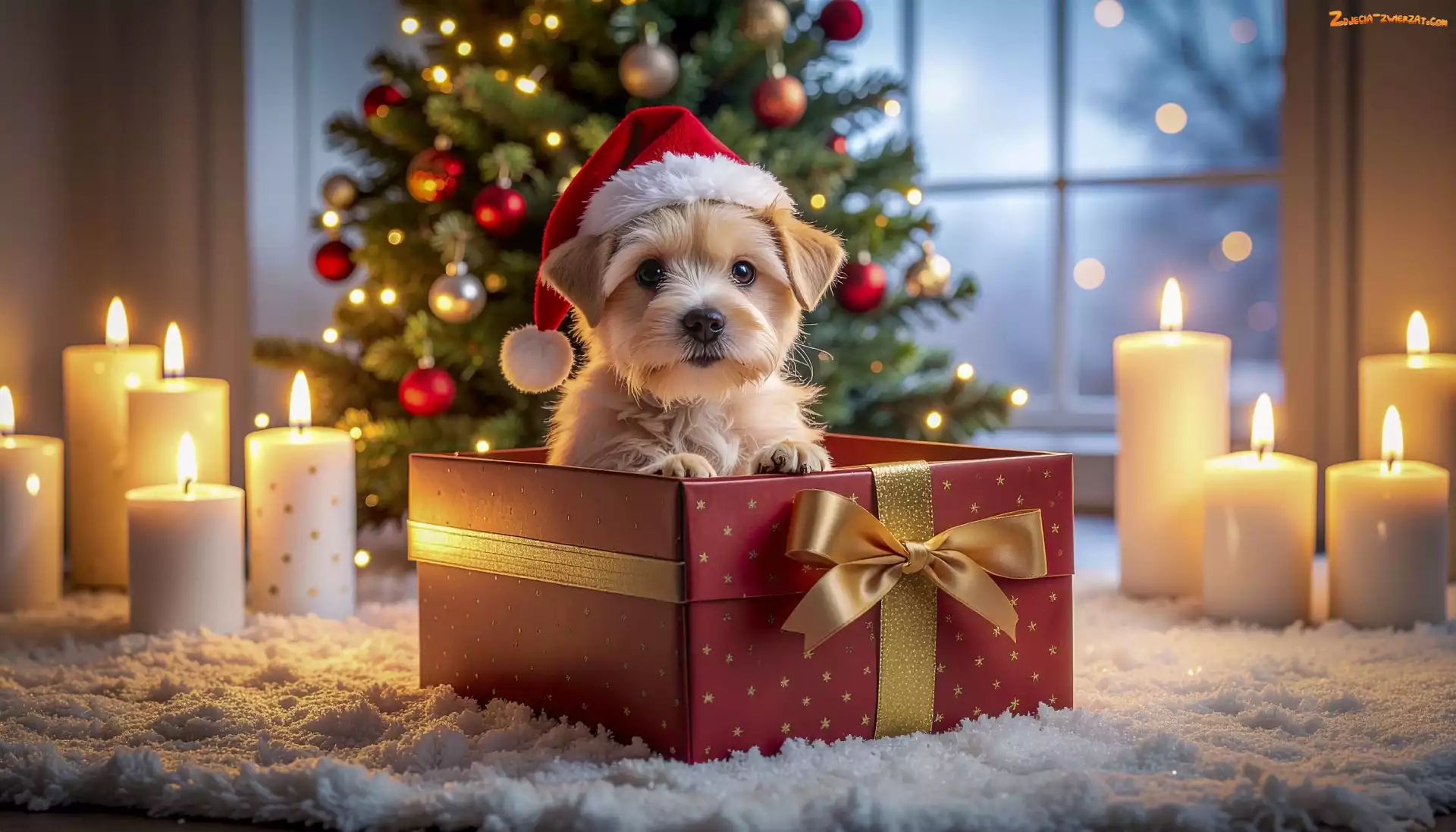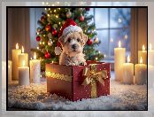 Zdjęcie: Świece, Pies, Szczeniak, Prezent, Grafika AI, Boże Narodzenie, Choinka