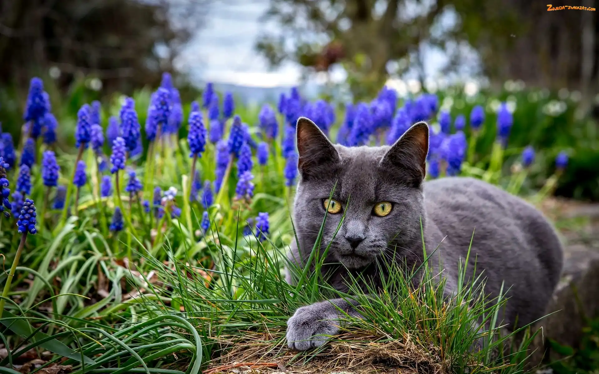 Zdjęcie: Szafirki, Kwiaty, Kot, Szary, Niebieskie