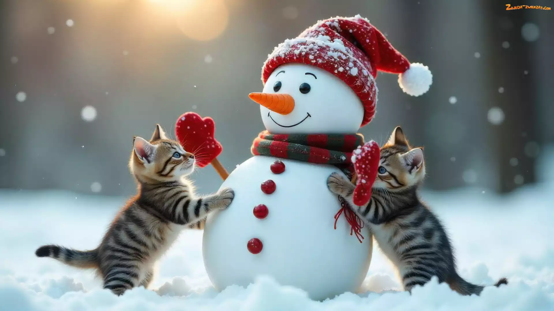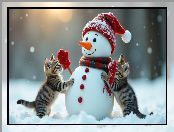 Zdjęcie: Dwa, Zima, Bałwanek, Szalik, Koty, Czapka, Małe
