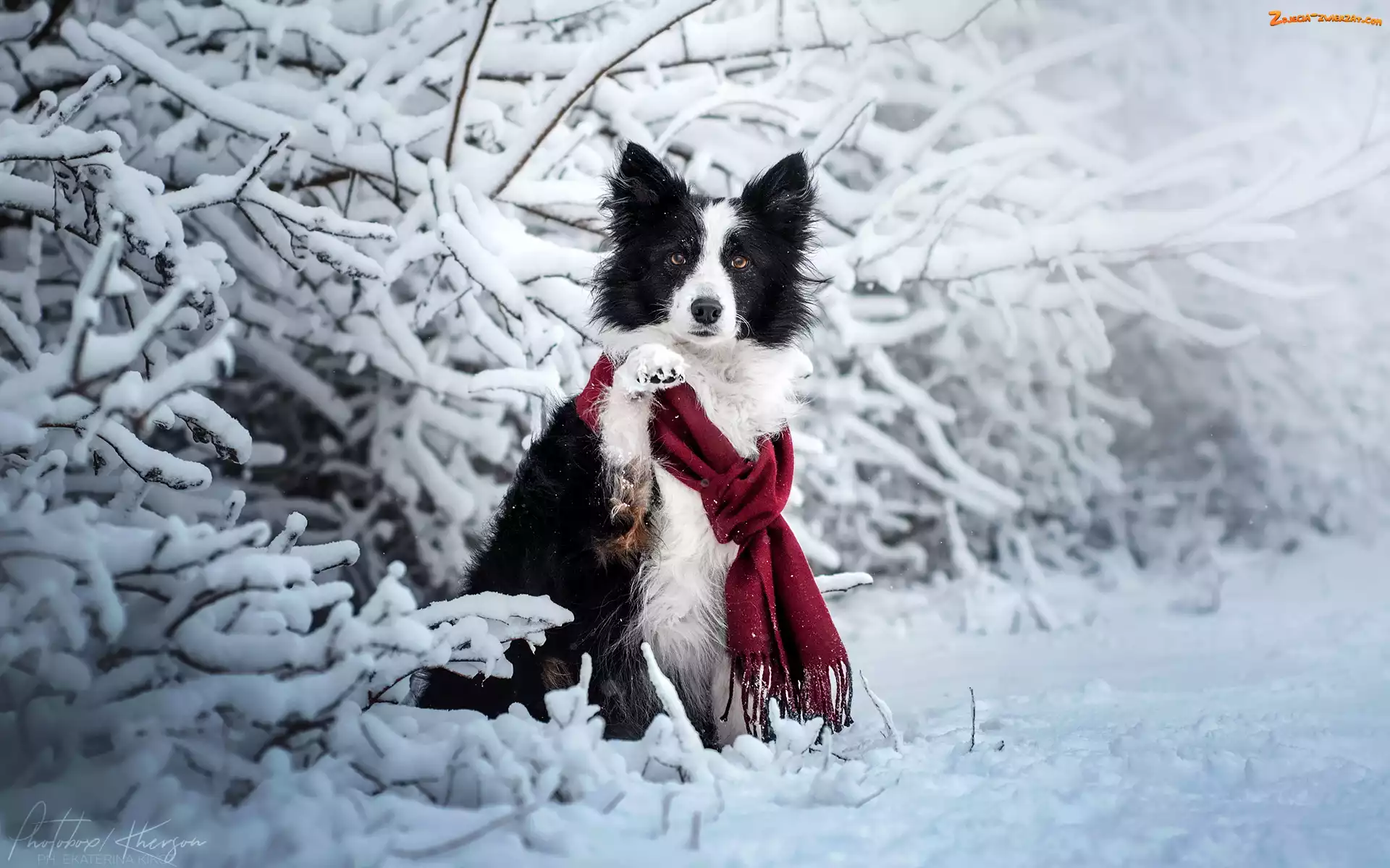 Zdjęcie: Zima, Border collie, Biało-czarny, Ośnieżone, Gałązki, Pies, Szalik