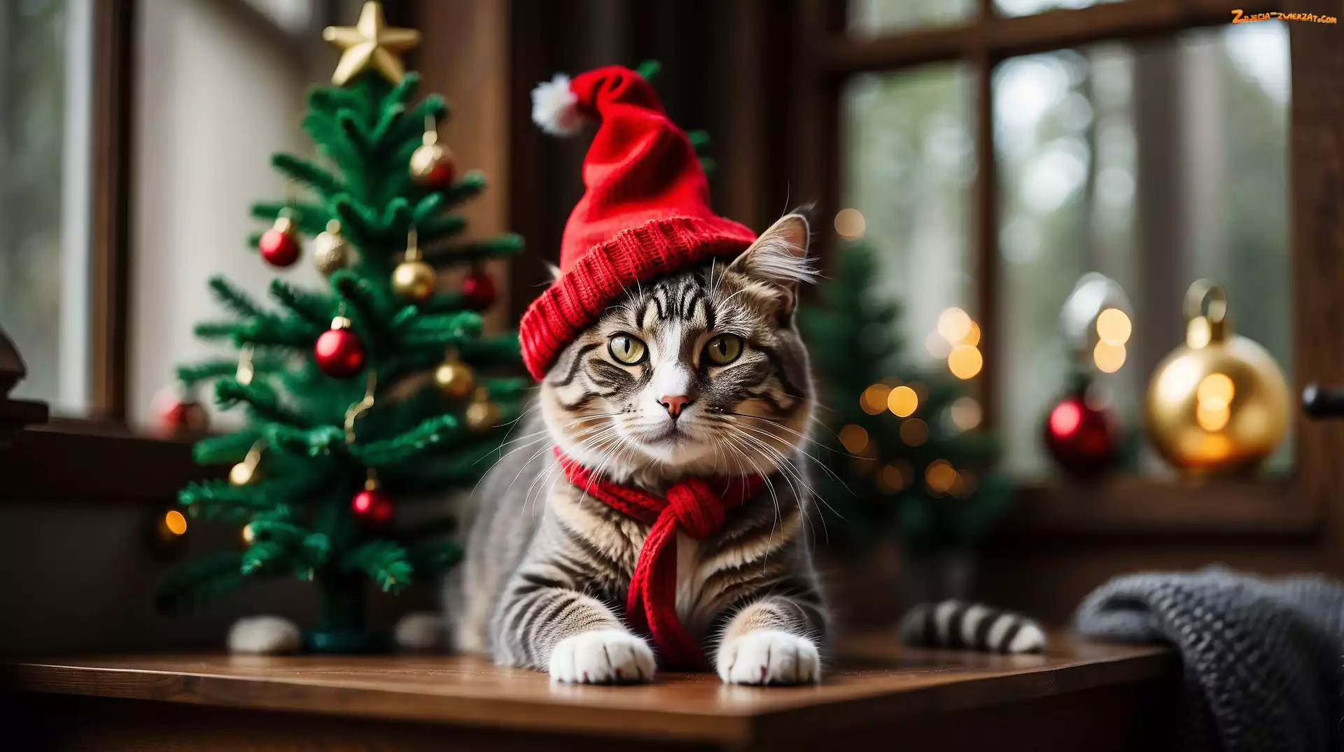 Zdjęcie: Stół, Kot, Czerwona, Szalik, AI, Czapka, Choinka