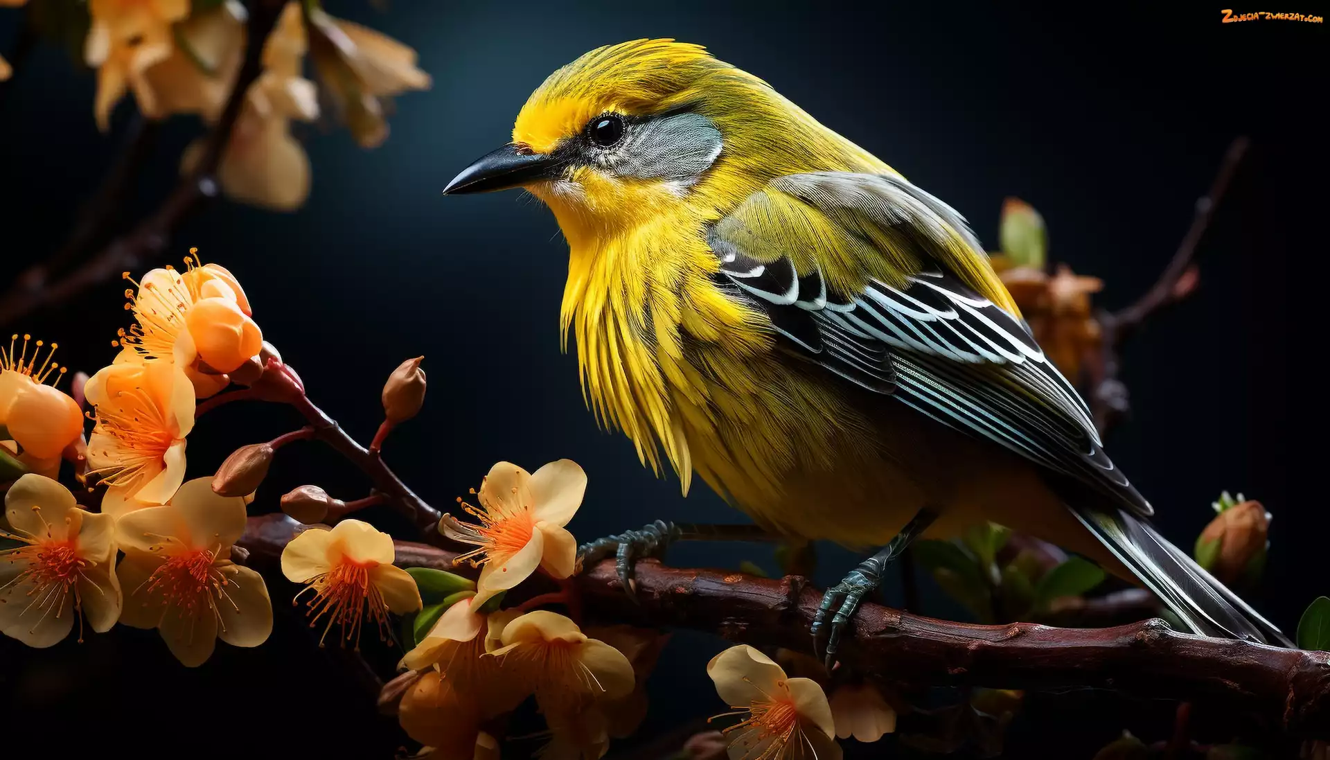 Zdjęcie: Żółto-szary, Ptak, Kwiaty, Gałązka