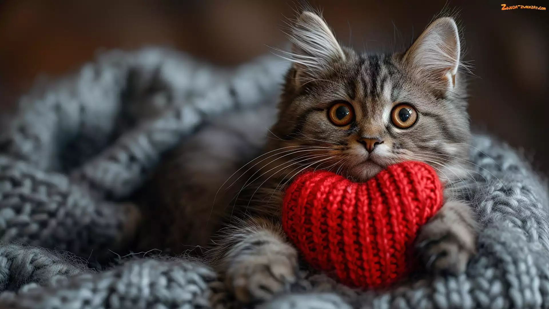 Zdjęcie: Ciemne tło, Spojrzenie, Szary, Kotek, Włóczkowe, Serduszko