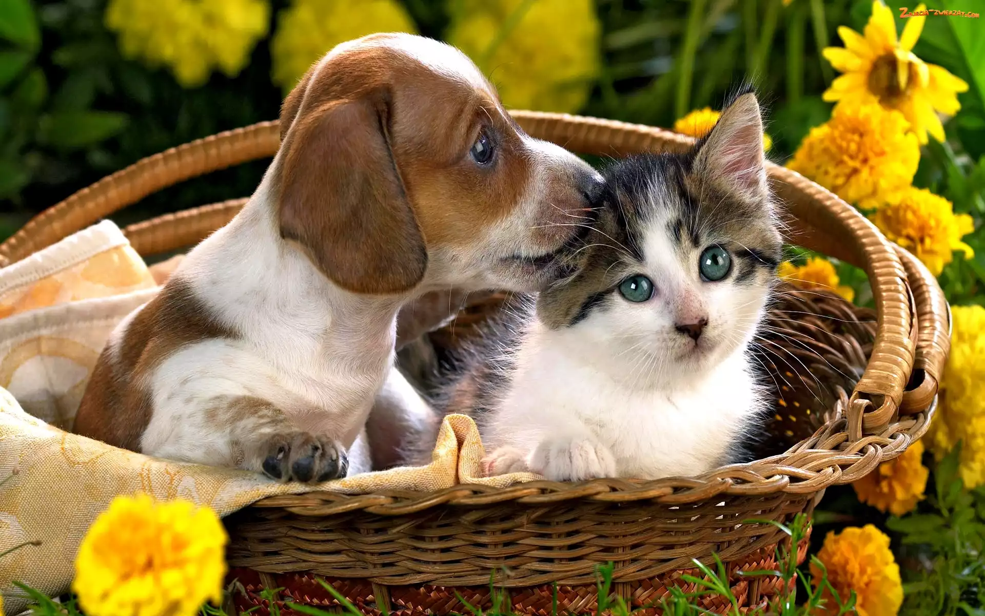 Zdjęcie: Kwiaty, Koszyk, Szczeniaczek, Kot, Beagle