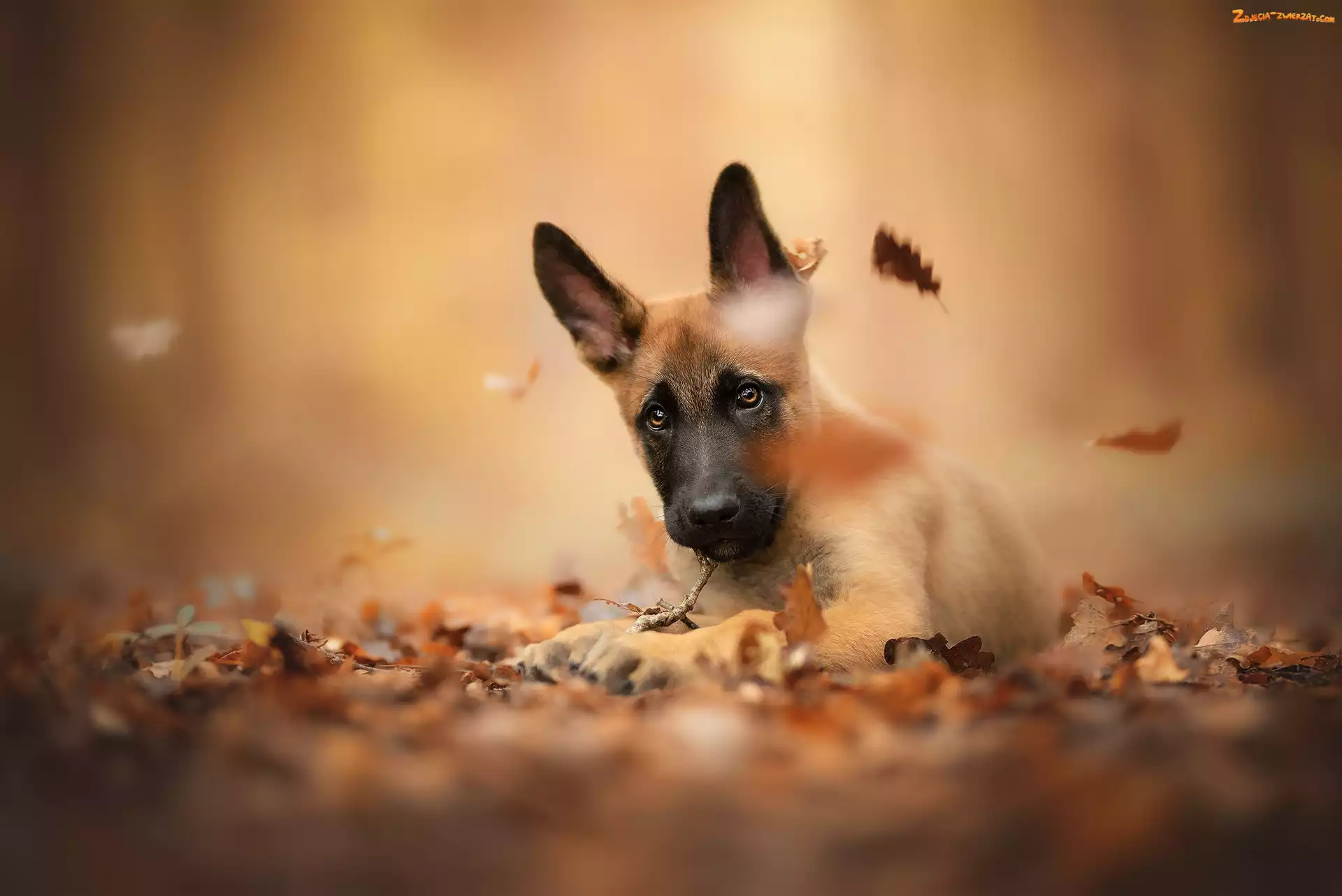 Szczeniak, Liście, Pies, Owczarek belgijski Malinois