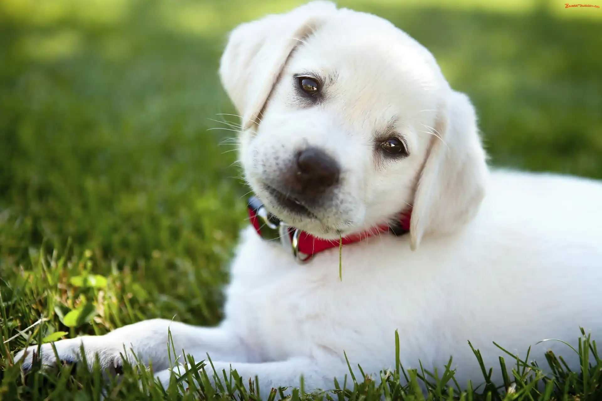 Zdjęcie: Trawa, Obroża, Szczeniak, Biały, Labrador retriever