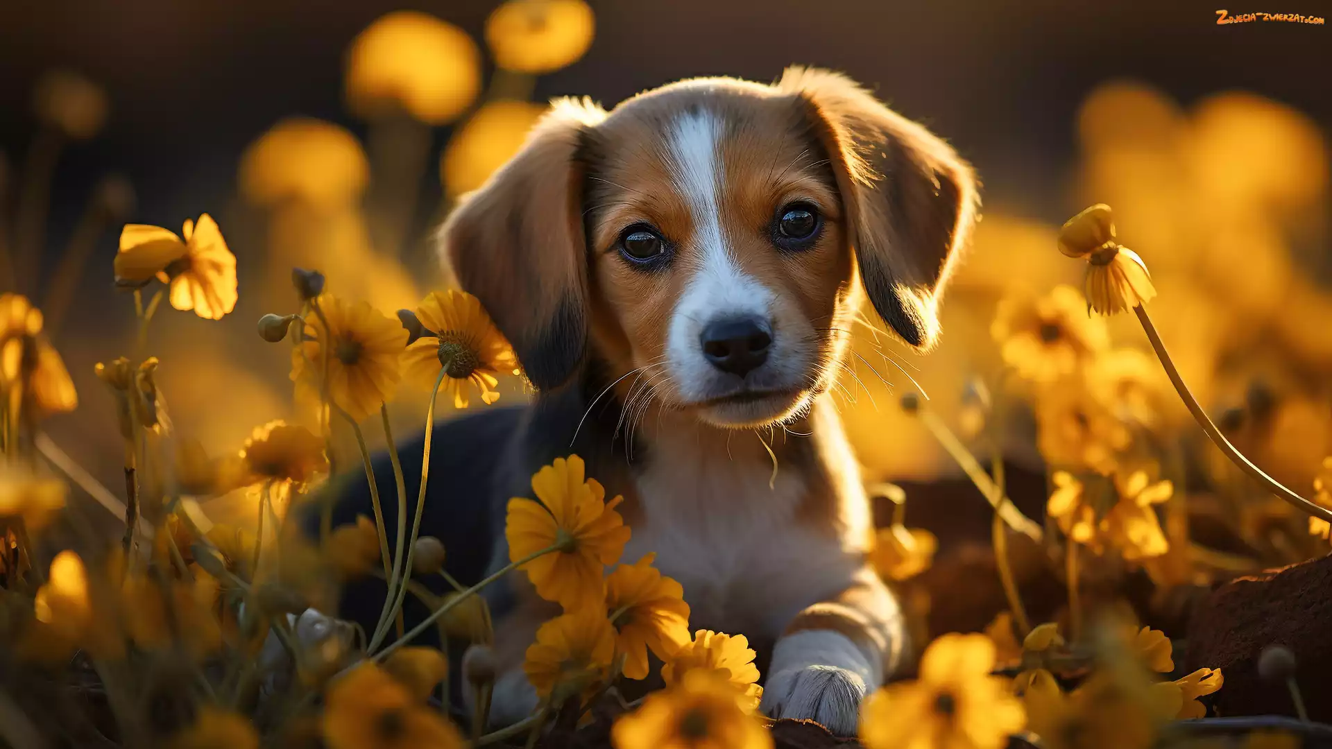 Spojrzenie, Szczeniak, Kwiaty, Leżący, Pies
