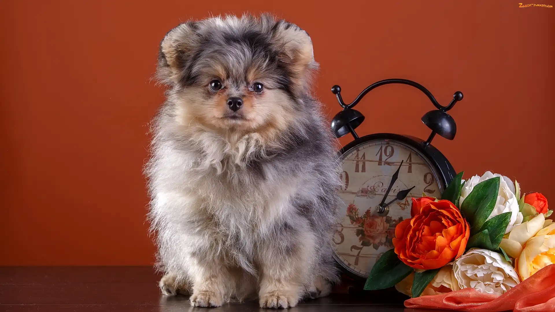 Zdjęcie: Szczeniak, Kwiaty, Szpic miniaturowy, Budzik