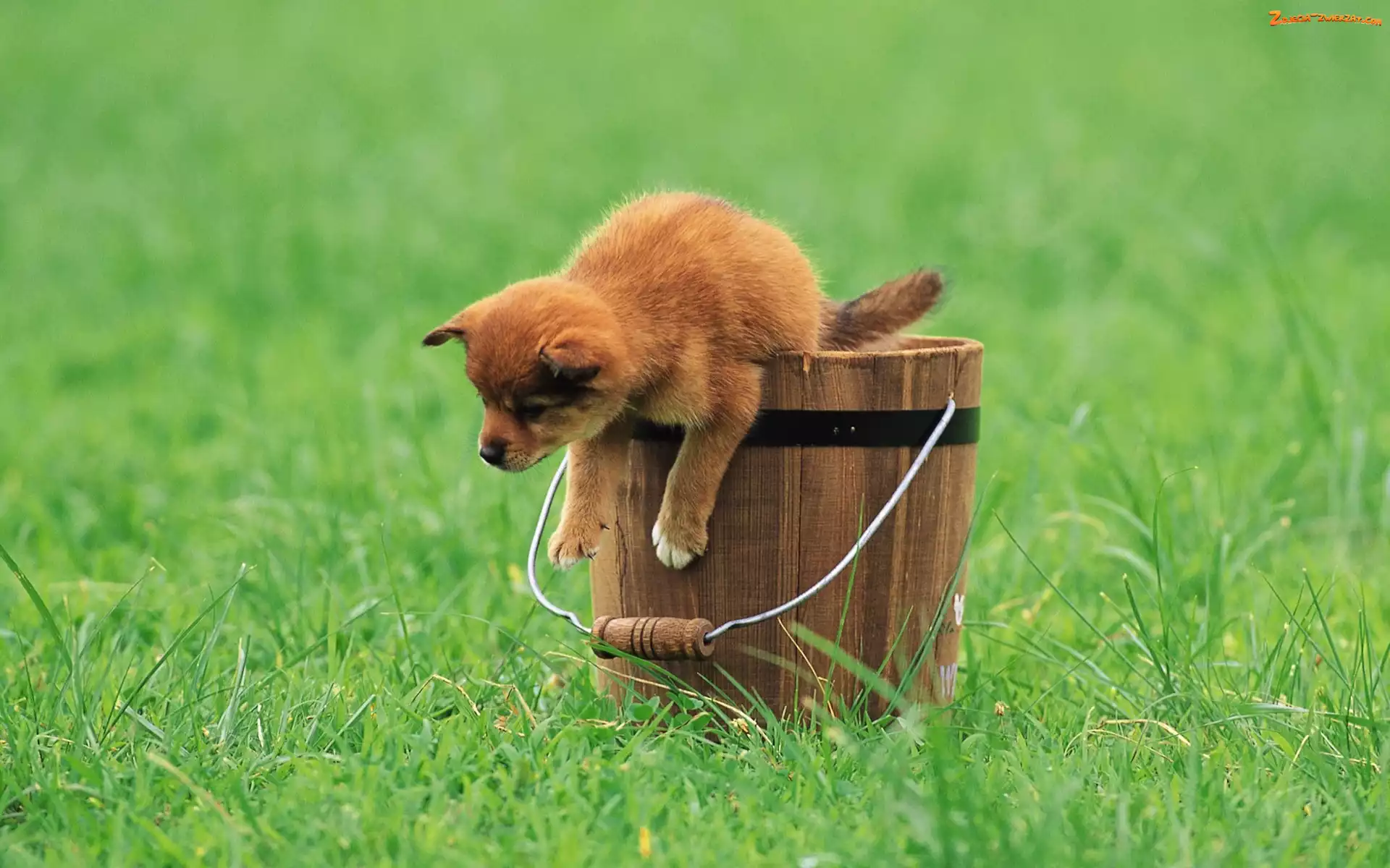 Zdjęcie: Trawa, Szczeniak, Wiaderko