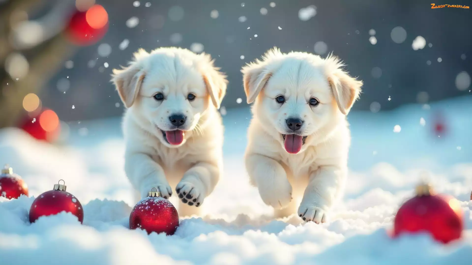 Zdjęcie: Śnieg, Dwa, Białe, Szczeniaki, AI, Psy, Bombki