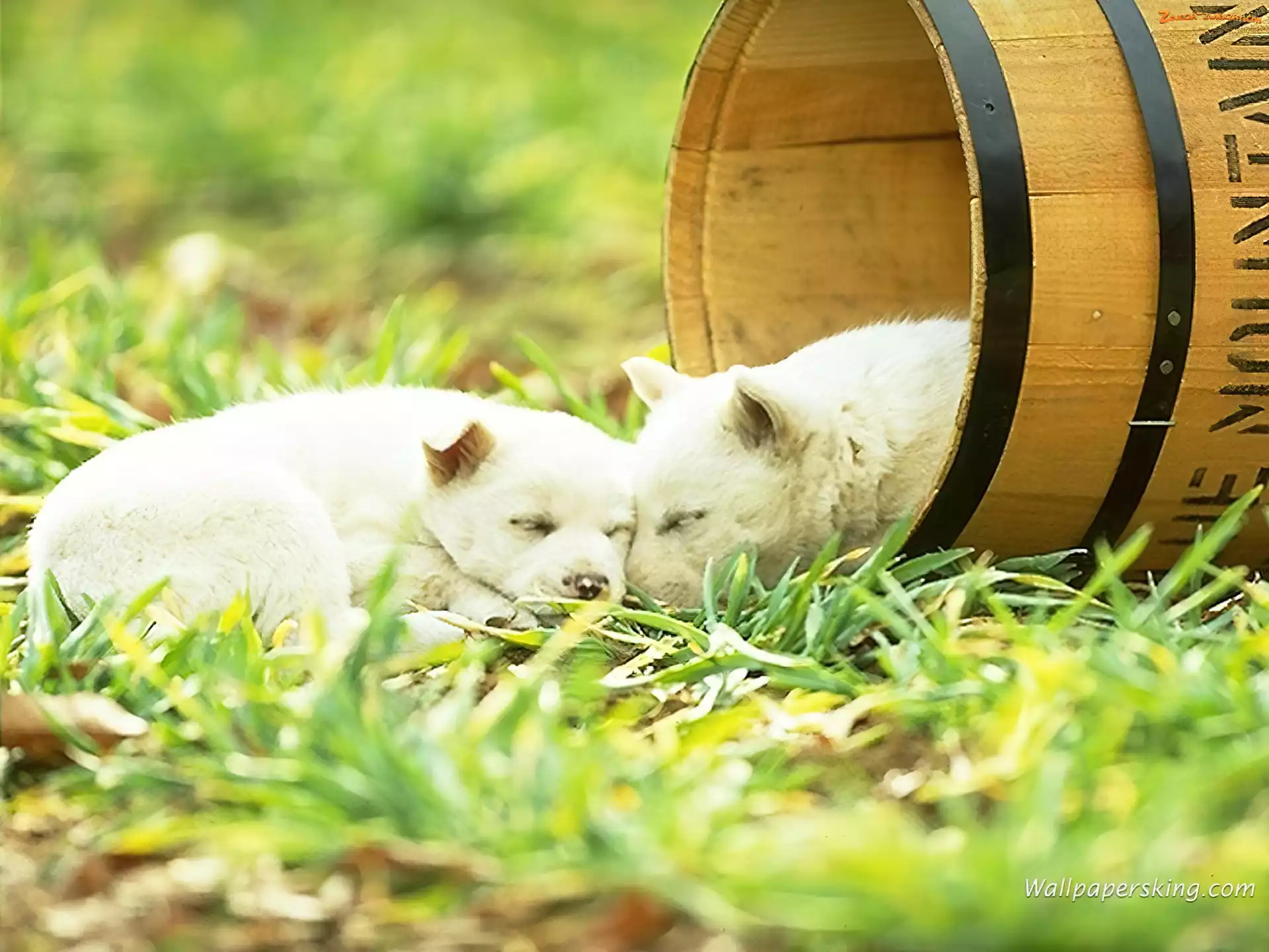 Zdjęcie: Psy, szczeniaki, beczka, trawa