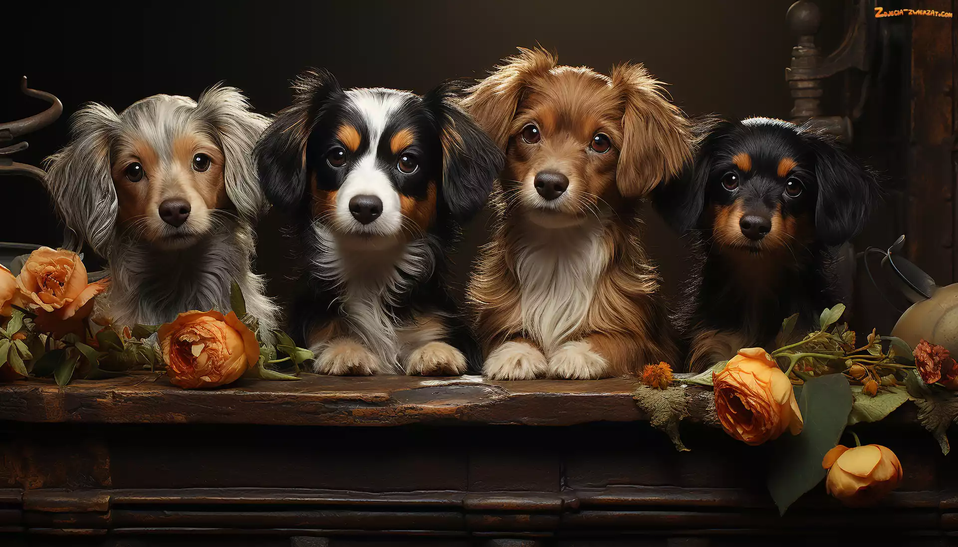 Zdjęcie: Kwiaty, Szczeniaki, Róże, Cztery, Psy