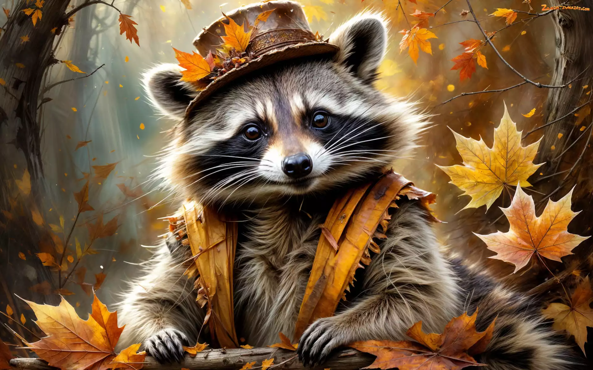 Zdjęcie: Liście, Jesień, Grafika, Szop pracz, Kapelusz