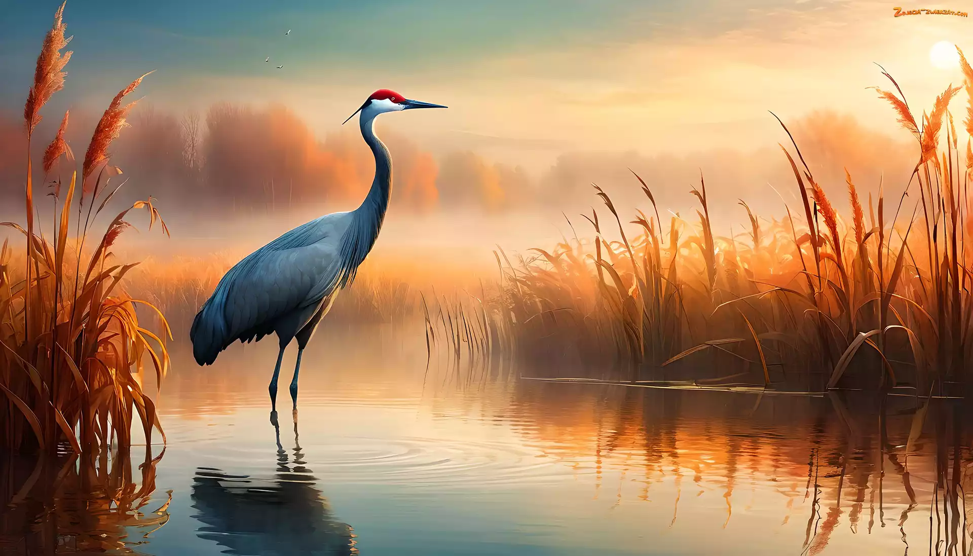 Mgła, Szuwary, Grafika, Żuraw, Ptak