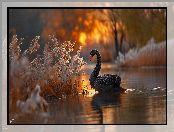 Zdjęcie: Grafika AI, Jezioro, Czarny, Łabędź, Zachód słońca, Szuwary