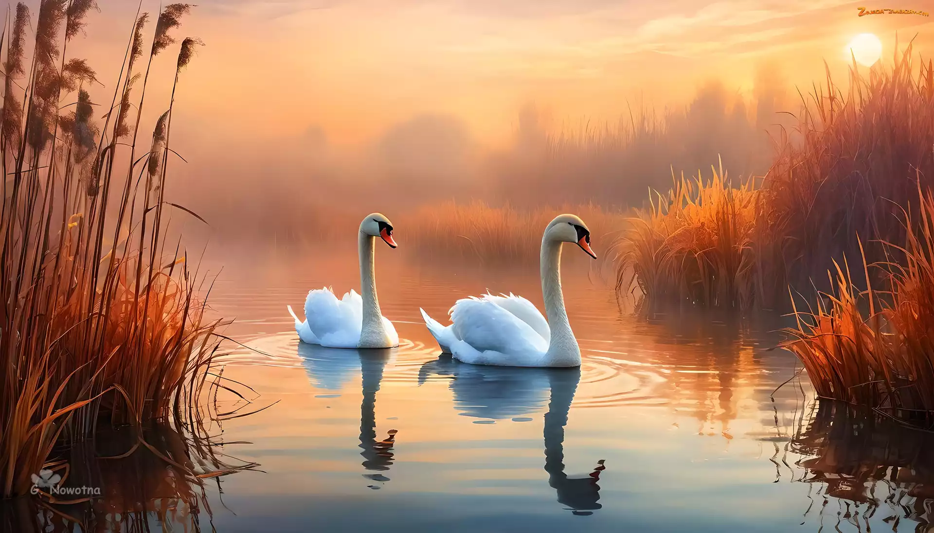 Zdjęcie: Łabędzie, Jezioro, Grafika, Szuwary