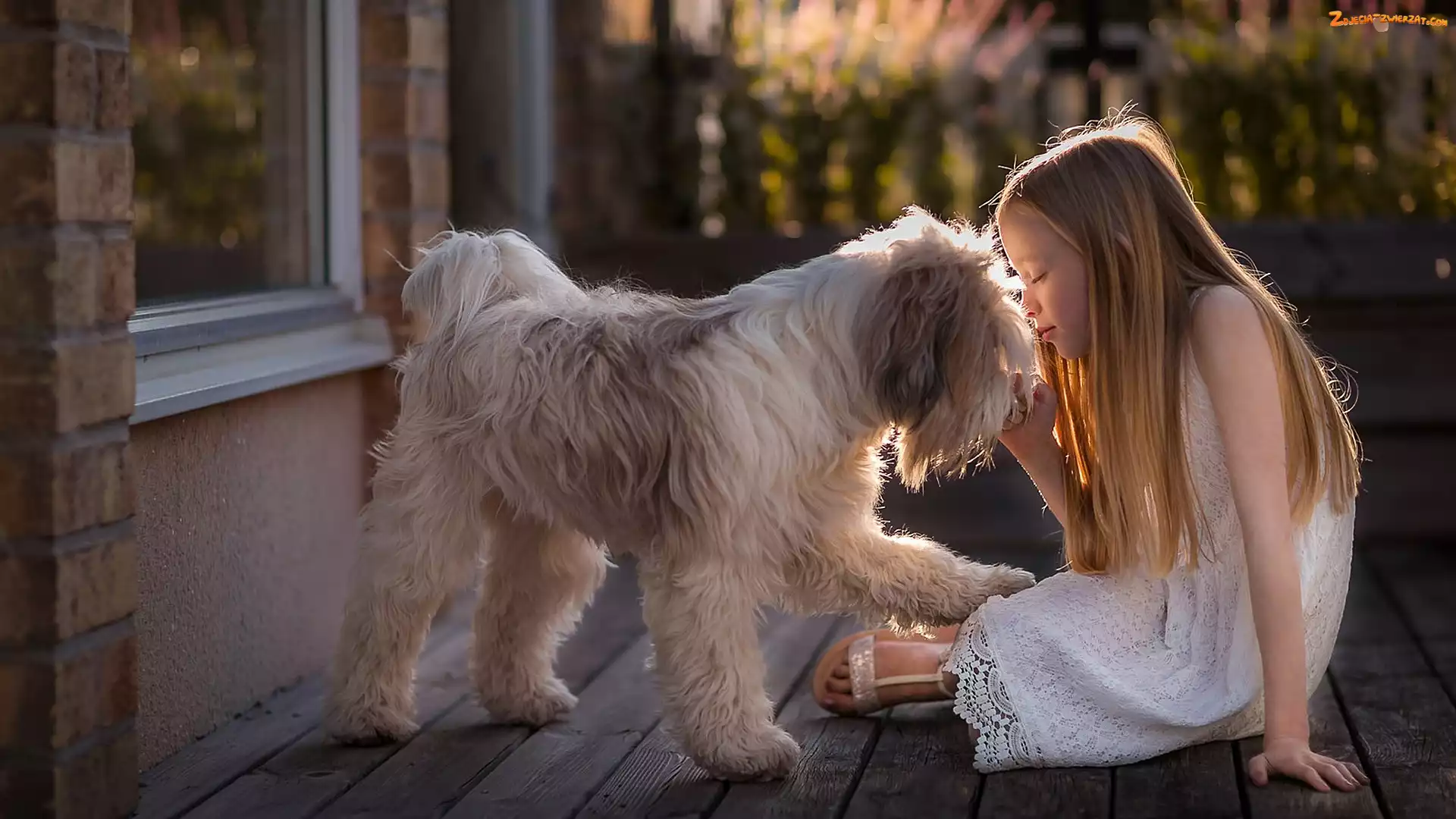 Zdjęcie: Taras, Okno, Terier tybetański, Pies, Dziewczynka