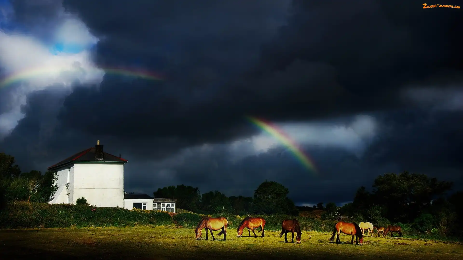 Tęcza, Budynek, Konie, Pastwisko