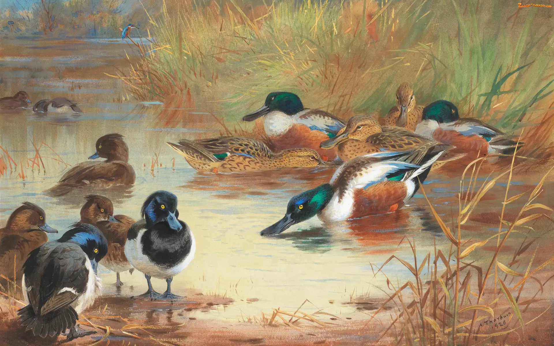 Archibald Thorburn, Reprodukcja obrazu, Jezioro, Kaczki, Malarstwo, Ptaki