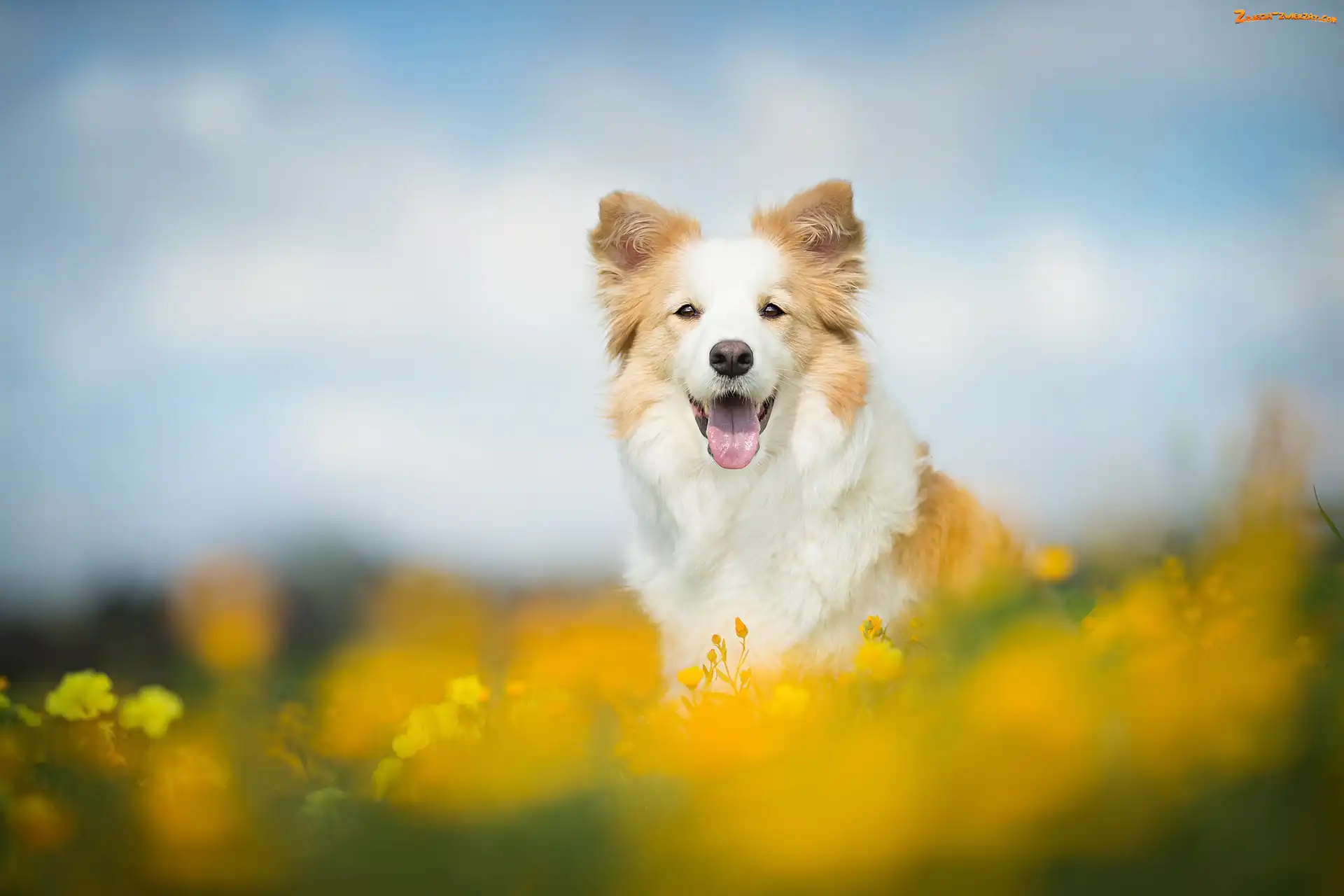 Zdjęcie: Tło, Rozmyte, Łąka, Border collie, Kwiaty