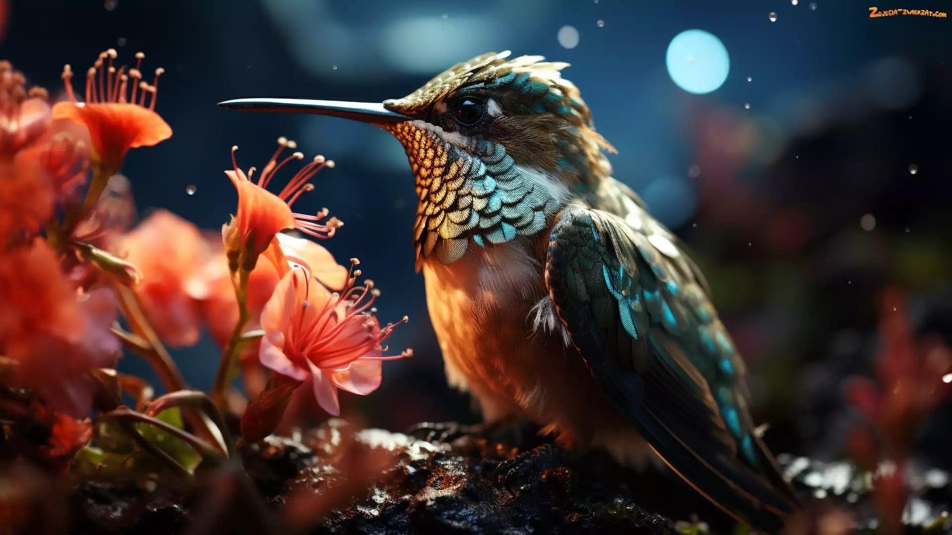 Zdjęcie: Kwiaty, Pomarańczowe, Ciemne tło, Ptak, Koliber