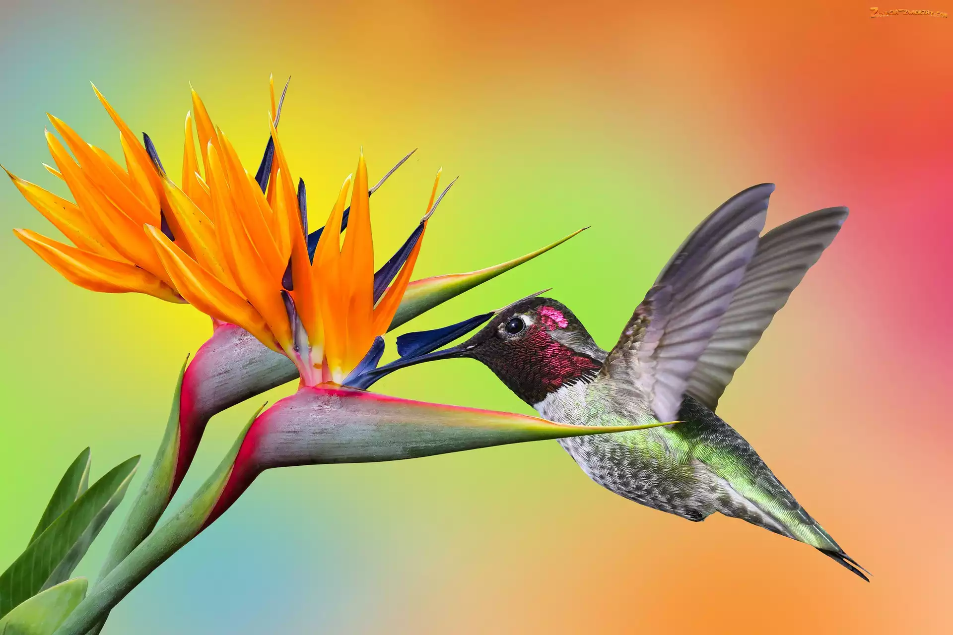 Zdjęcie: Koliber, Kwiat, Kolorowe tło, Strelicja królewska