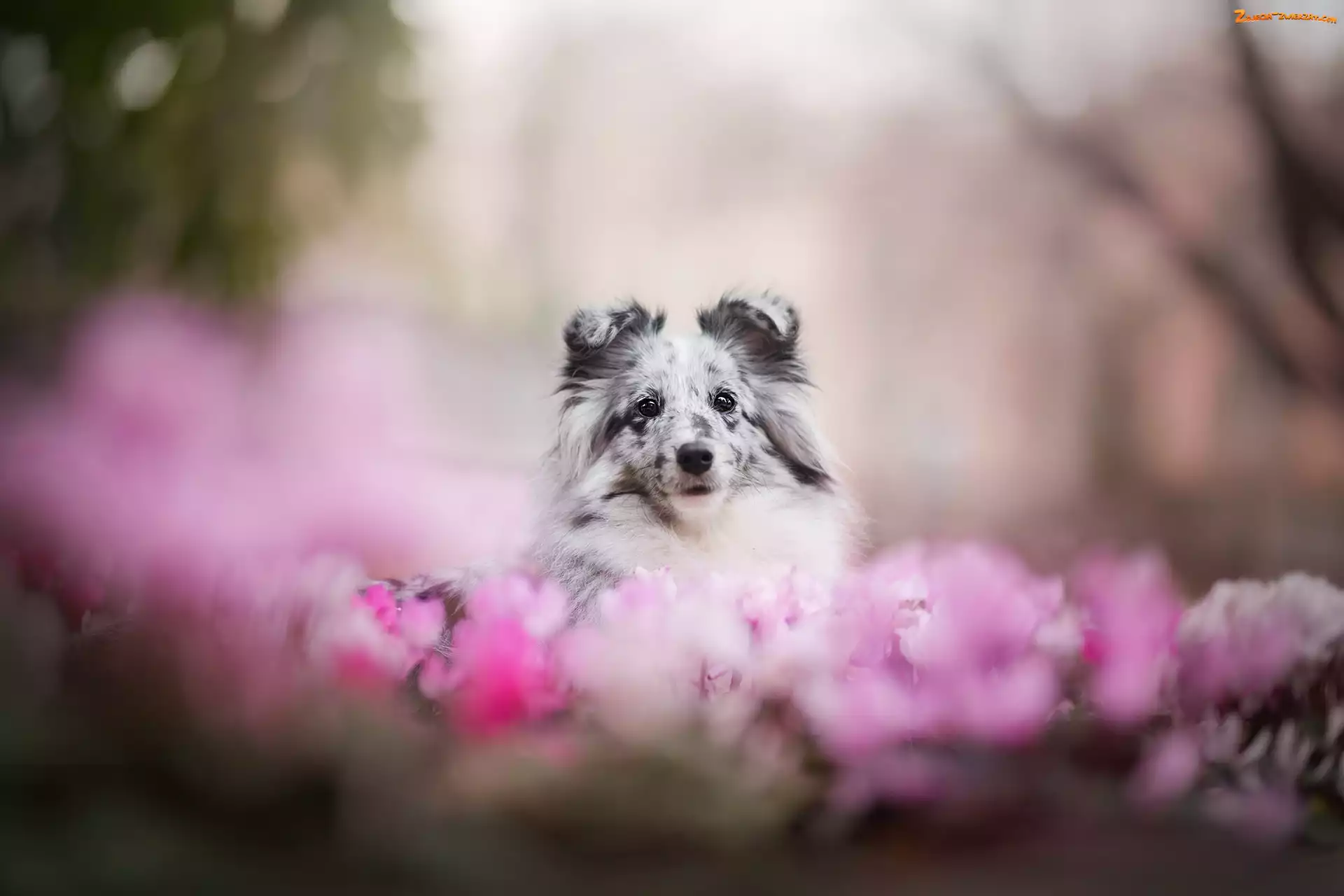 Zdjęcie: Tło, Rozmyte, Owczarek szetlandzki, Pies, Kwiaty