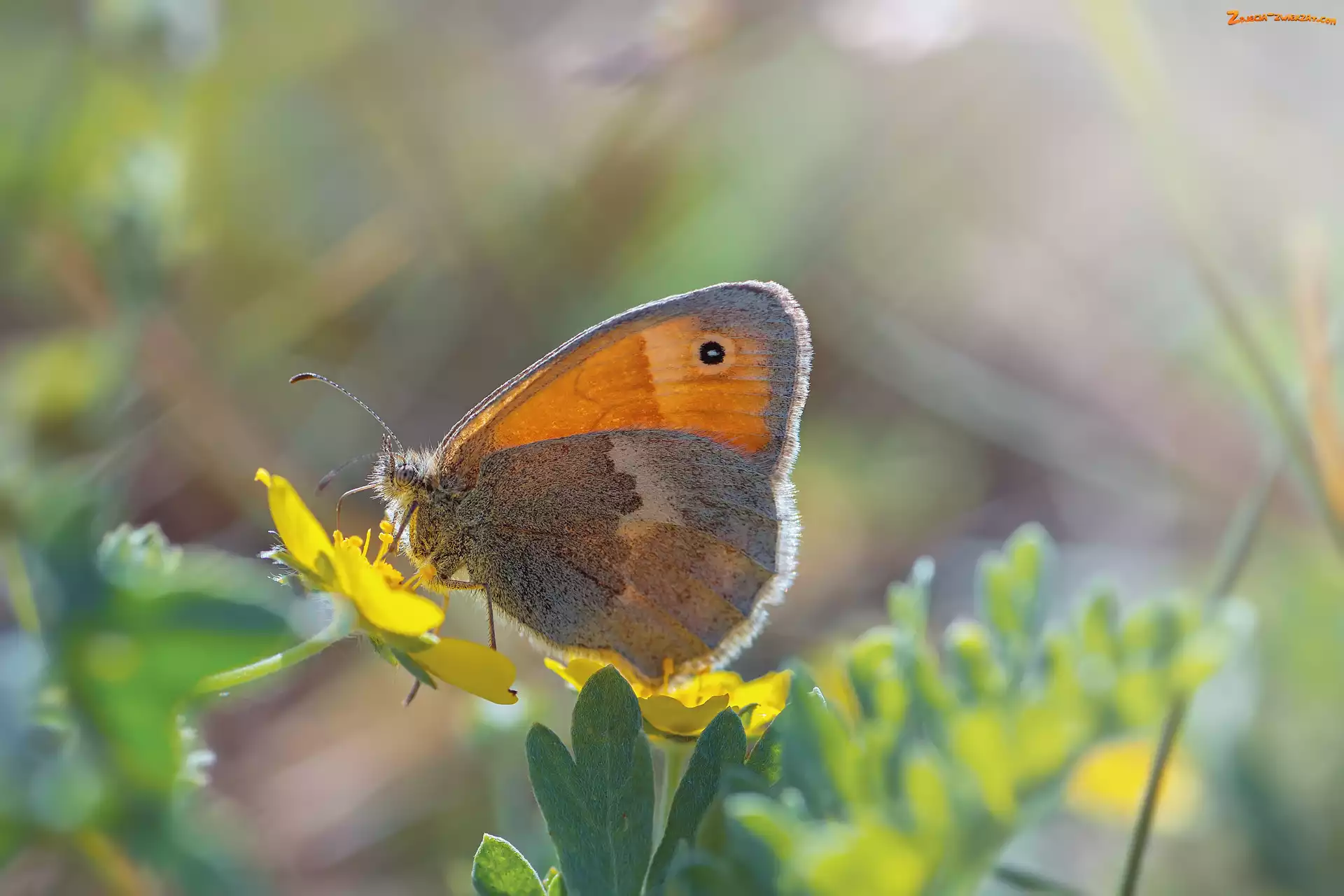 Zdjęcie: Rozmyte tło, Kwiaty, Strzępotek ruczajnik, Motyl, Żółte