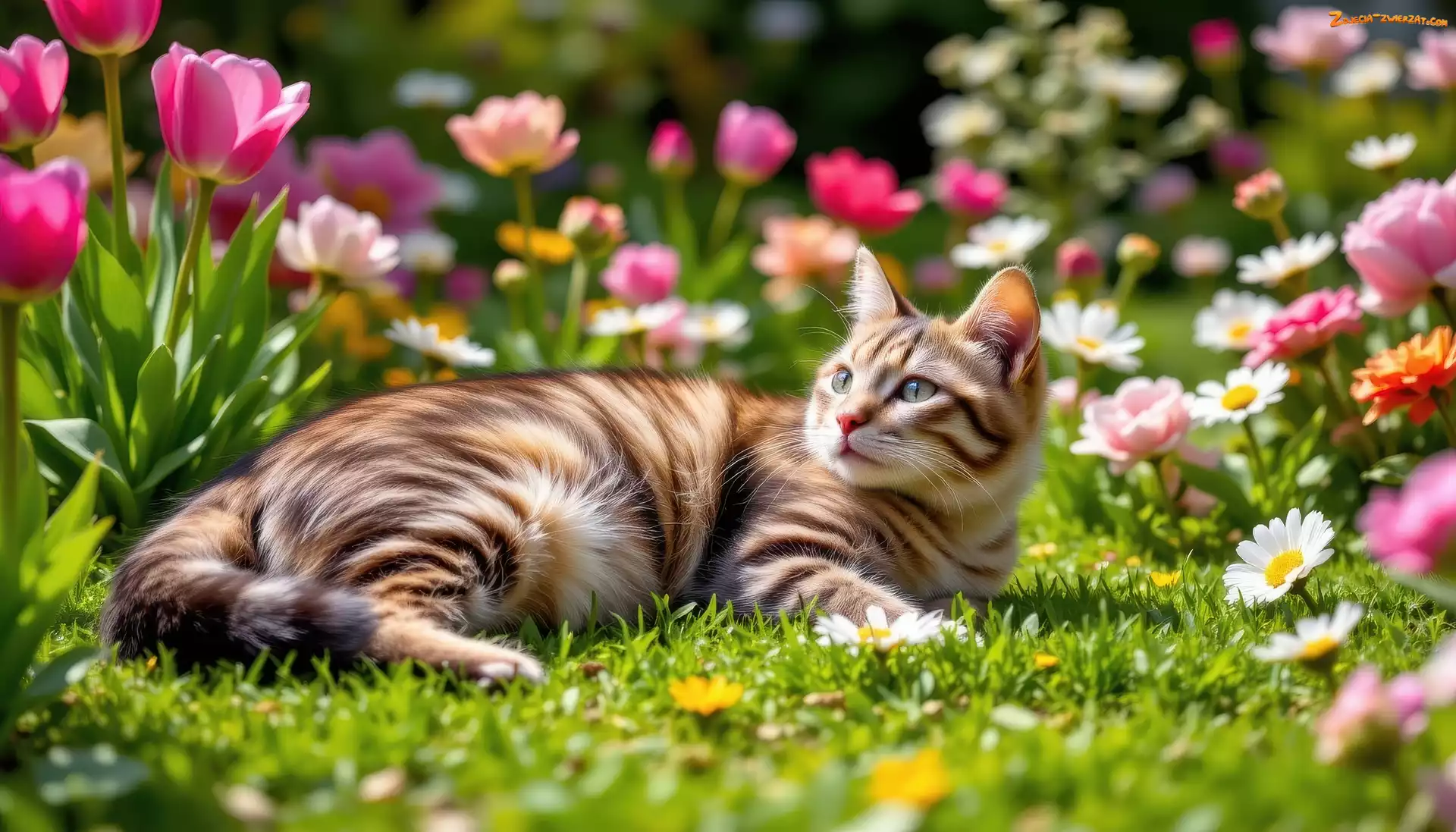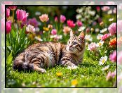 Zdjęcie: Kwiaty, Trawa, AI, Leżący, Kot