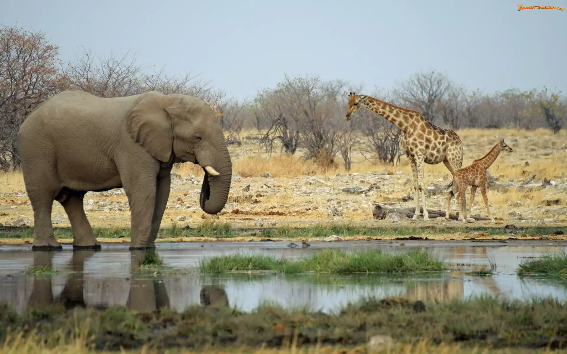 Zdjęcie: Trawa, Woda, Żyrafy, Dwie, Słoń
