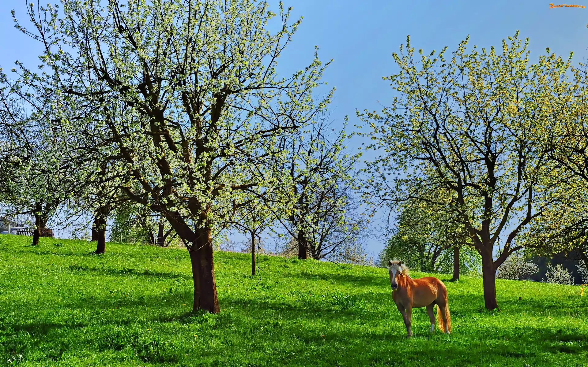 Zdjęcie: Trawa, Drzewa, Sad, Koń, Kwitnące