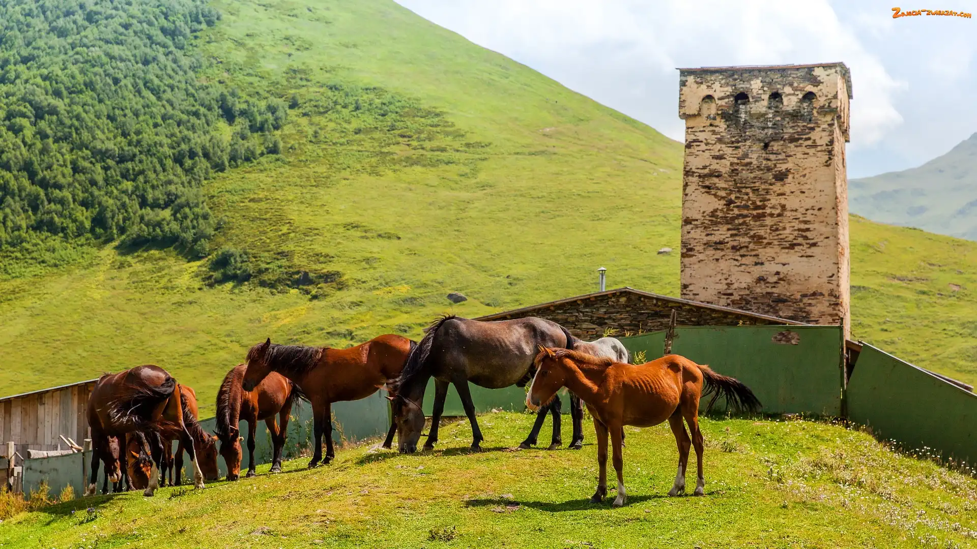 Zdjęcie: Trawa, Wieża, Konie, Budowla