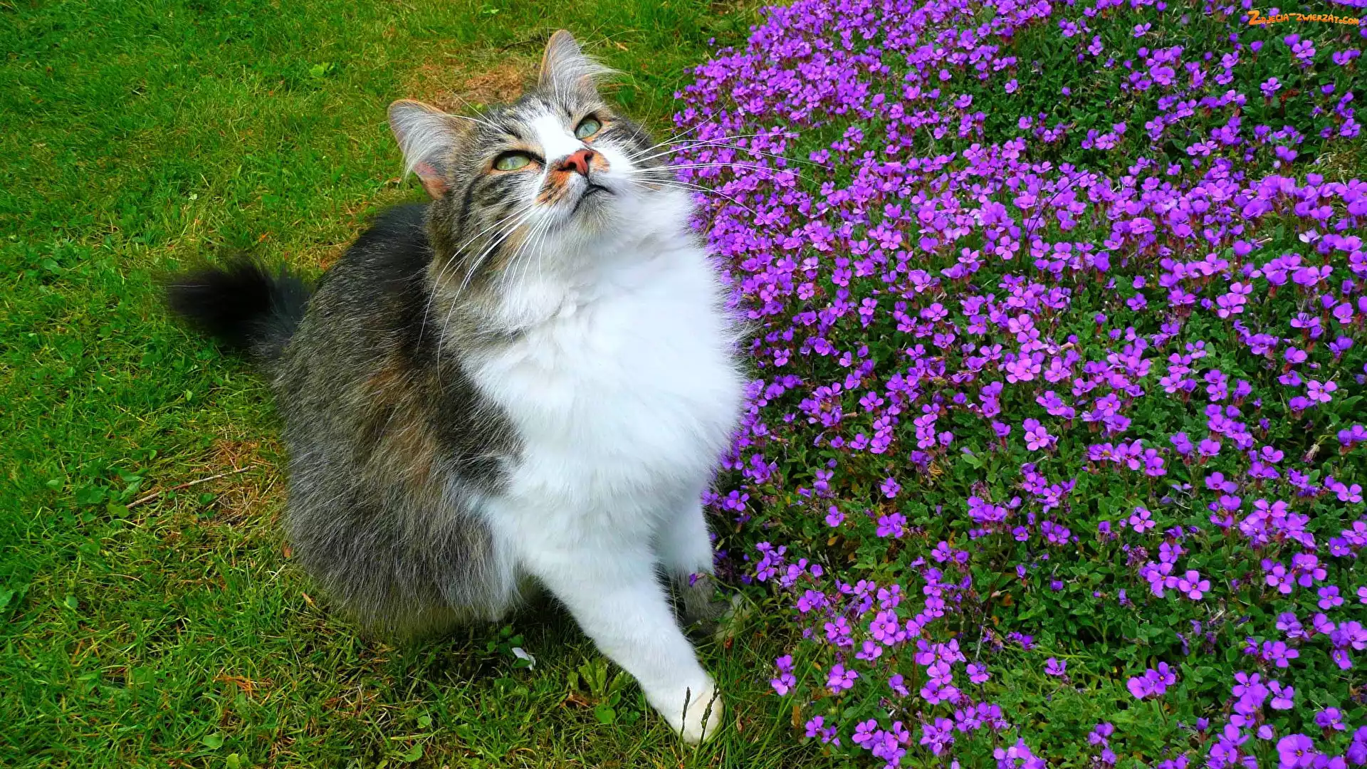 Zdjęcie: Trawa, Kwiaty, Spojrzenie, Kot, Fioletowe