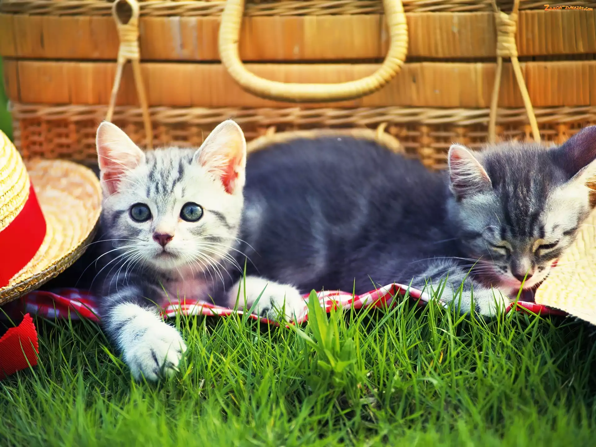 Zdjęcie: Piknik, Koszyk, Trawa, Koty, Kapelusz