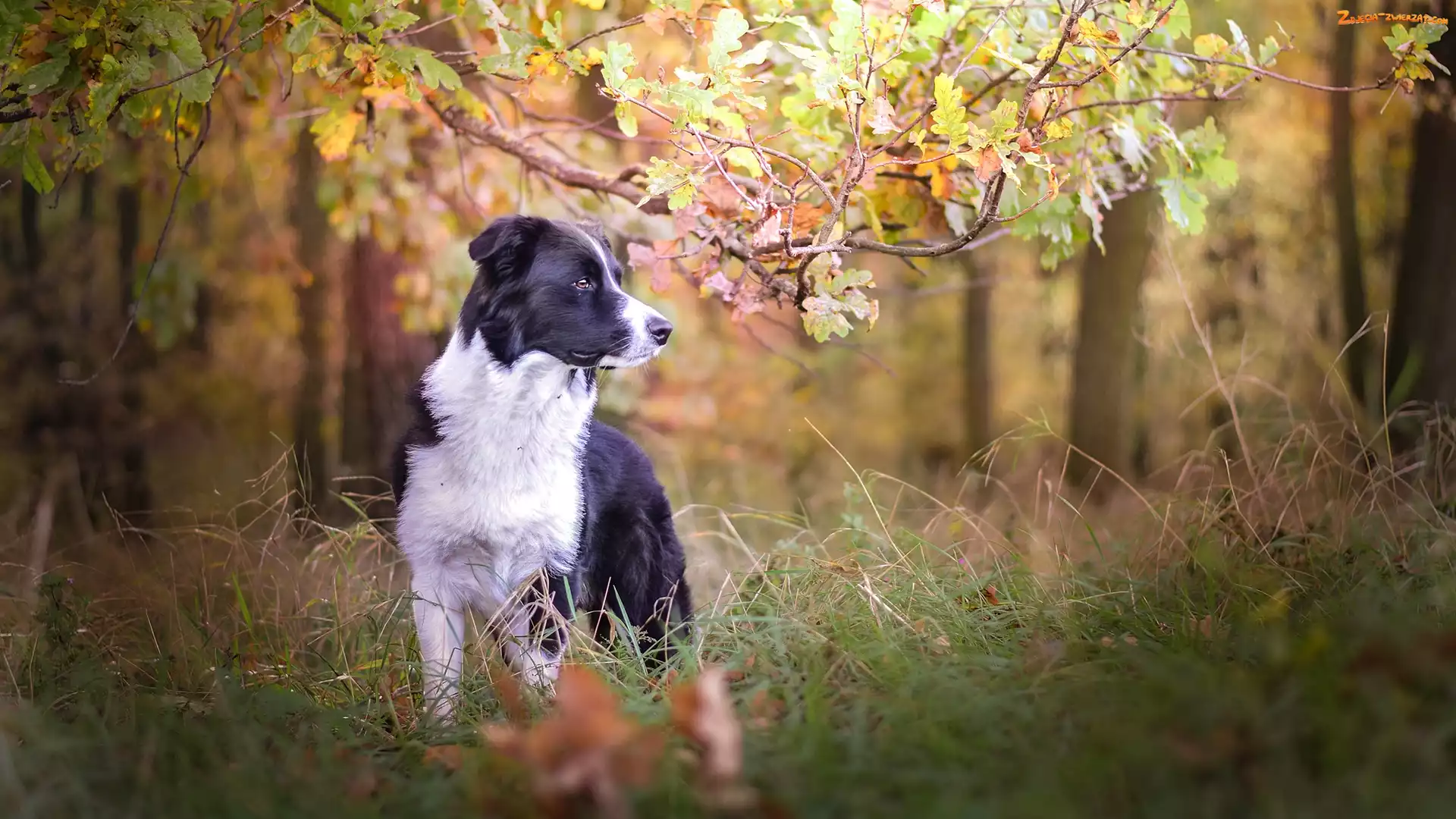 Zdjęcie: Liście, Trawa, Pies, Drzewa, Gałęzie, Border collie, Las