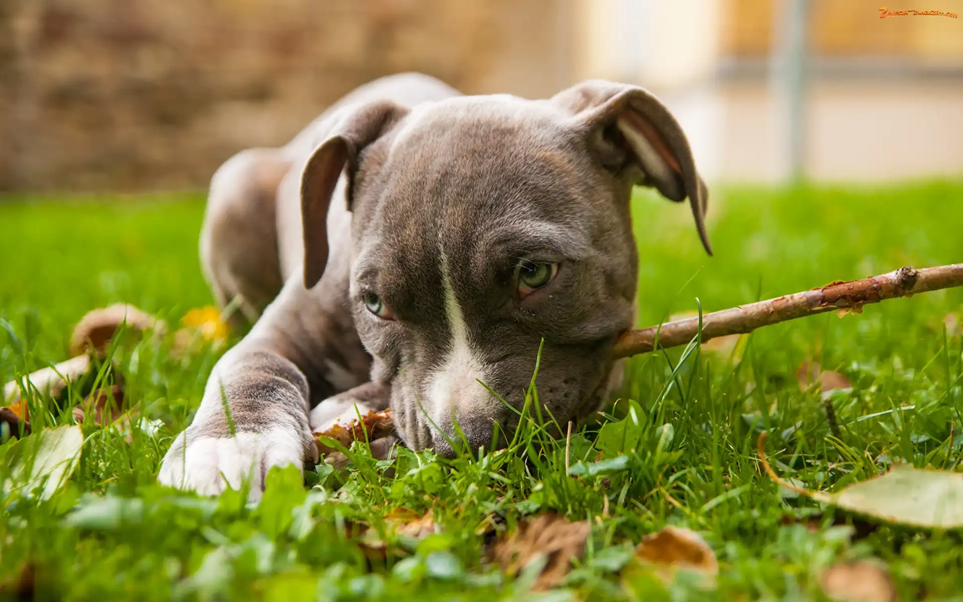 Patyk, Amstaff, Pies, Łąka, Liście, Amerykański staffordshire terier, Szczeniak, Trawa