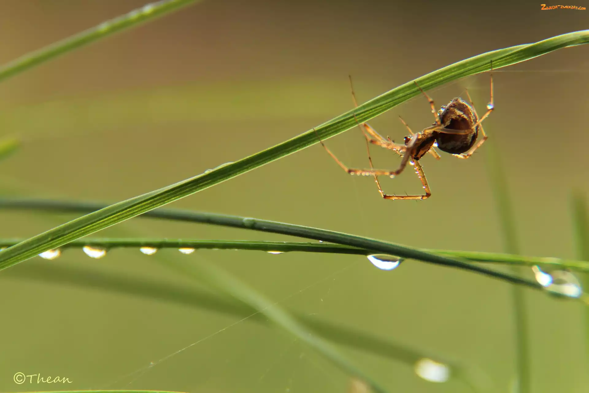 Zdjęcie: Trawa, Krople, Pająk, Źdźbła