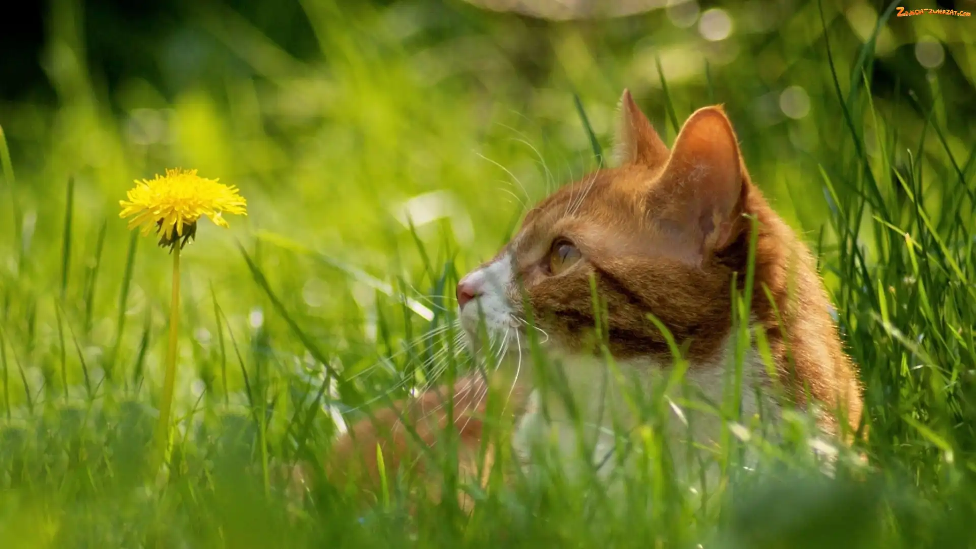 Zdjęcie: Trawa, Mniszek, Kot, Rudy, Łąka