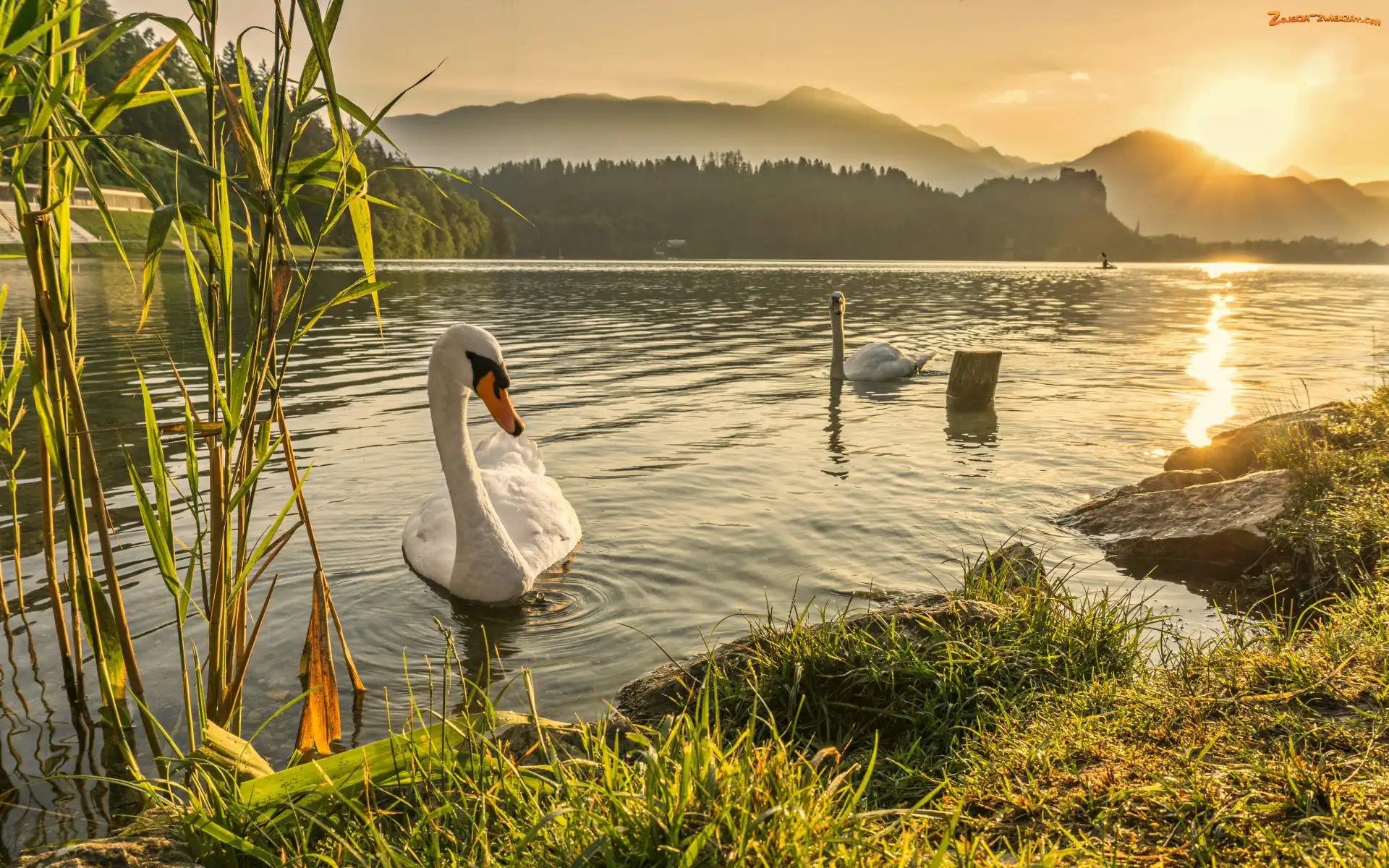 Zdjęcie: Drzewa, Wschód słońca, Dwa, Góry, Trzciny, Jezioro, Łabędzie, Trawa