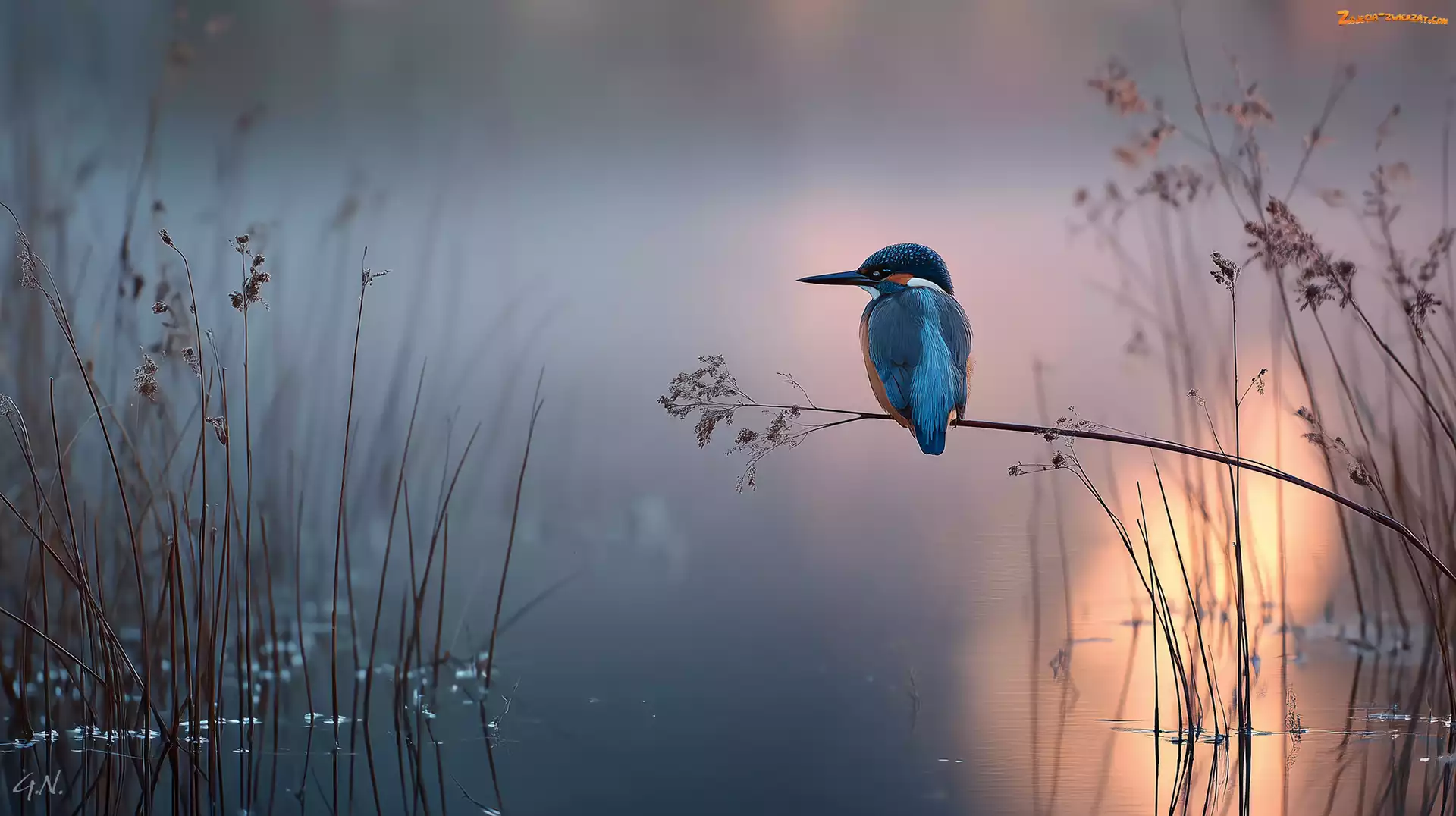 Zdjęcie: Zimorodek, Trawy, Grafika AI, Jezioro