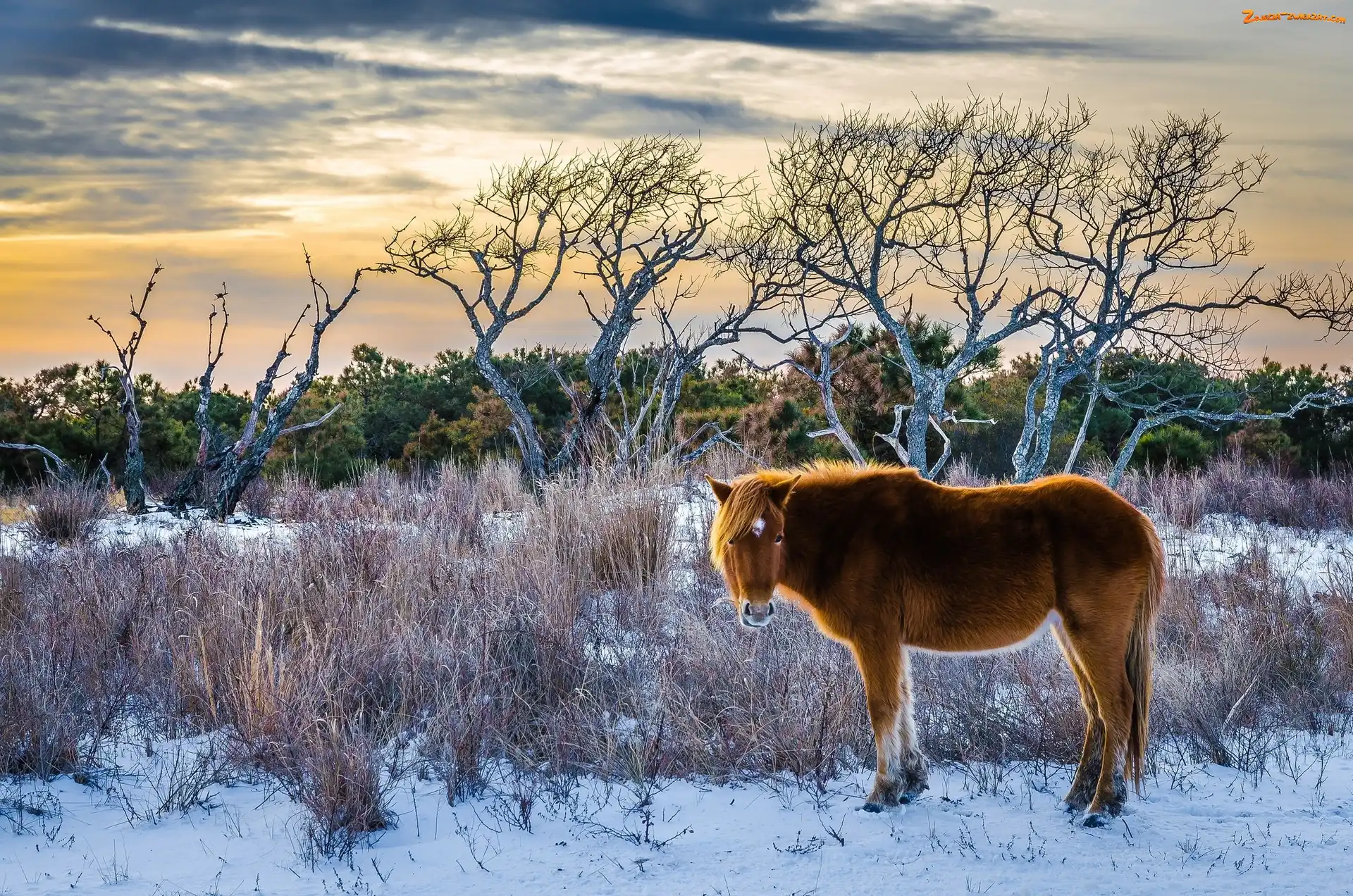Zdjęcie: Trawy, Śnieg, Koń, Drzewa