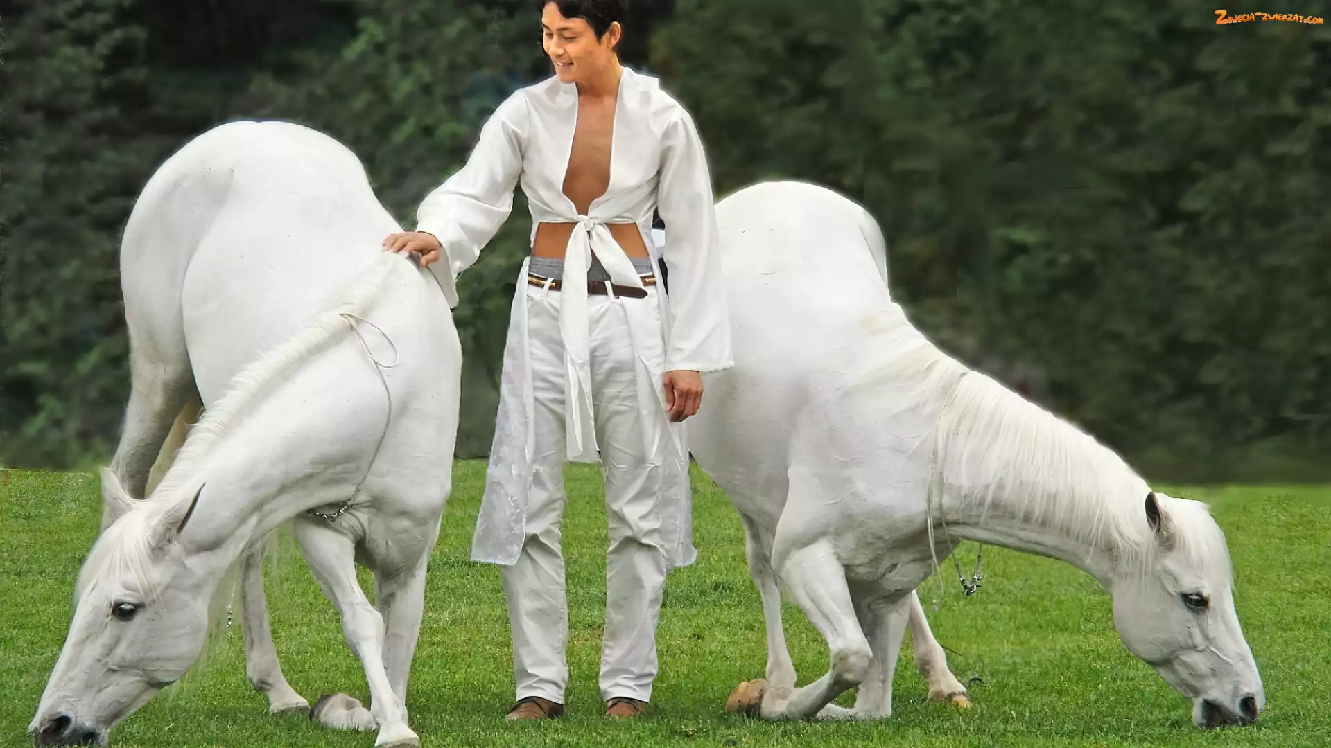 Zdjęcie: Treser, Mężczyzna, Dwa, Konie, Białe
