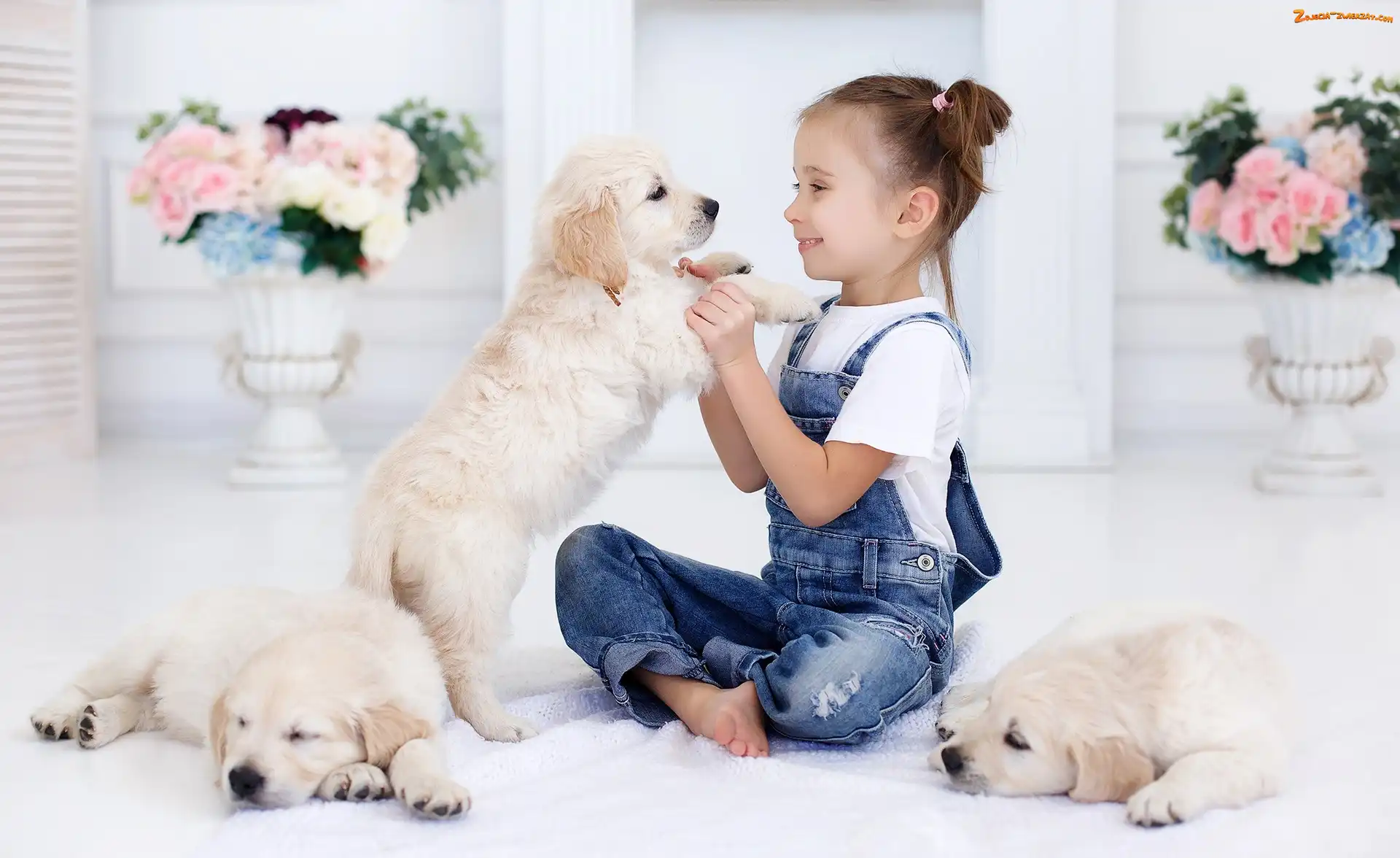 Zdjęcie: Trzy, Golden retrievery, Dziewczynka, Szczeniaki
