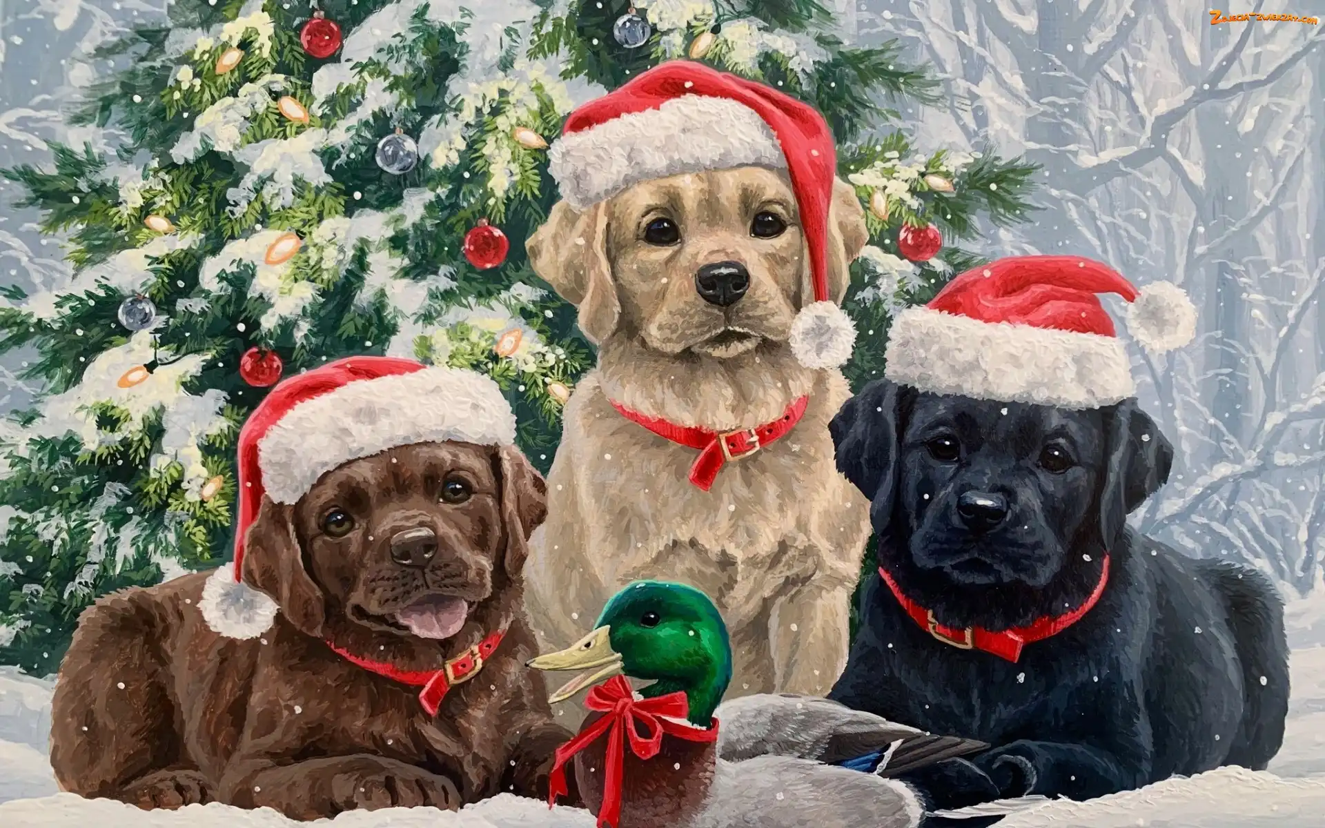 Zdjęcie: Kaczka, Abraham Hunter, Mikołaja, Malarstwo, Trzy, Psy, Choinka, Szczeniaki, Labradory retrievery, Czapki |