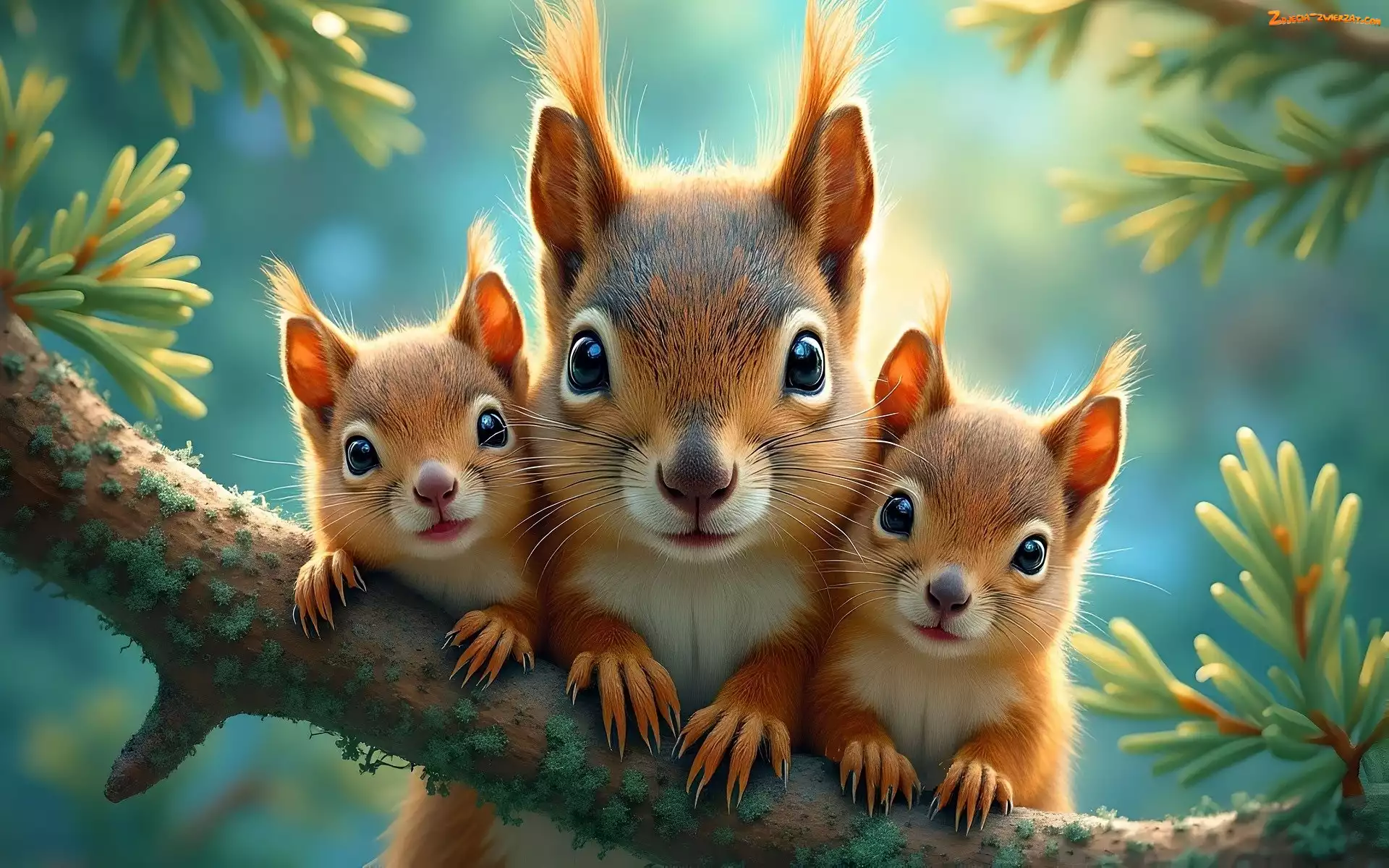 Sosna, Wiewiórki, Grafika, Trzy, Drzewo, Konar