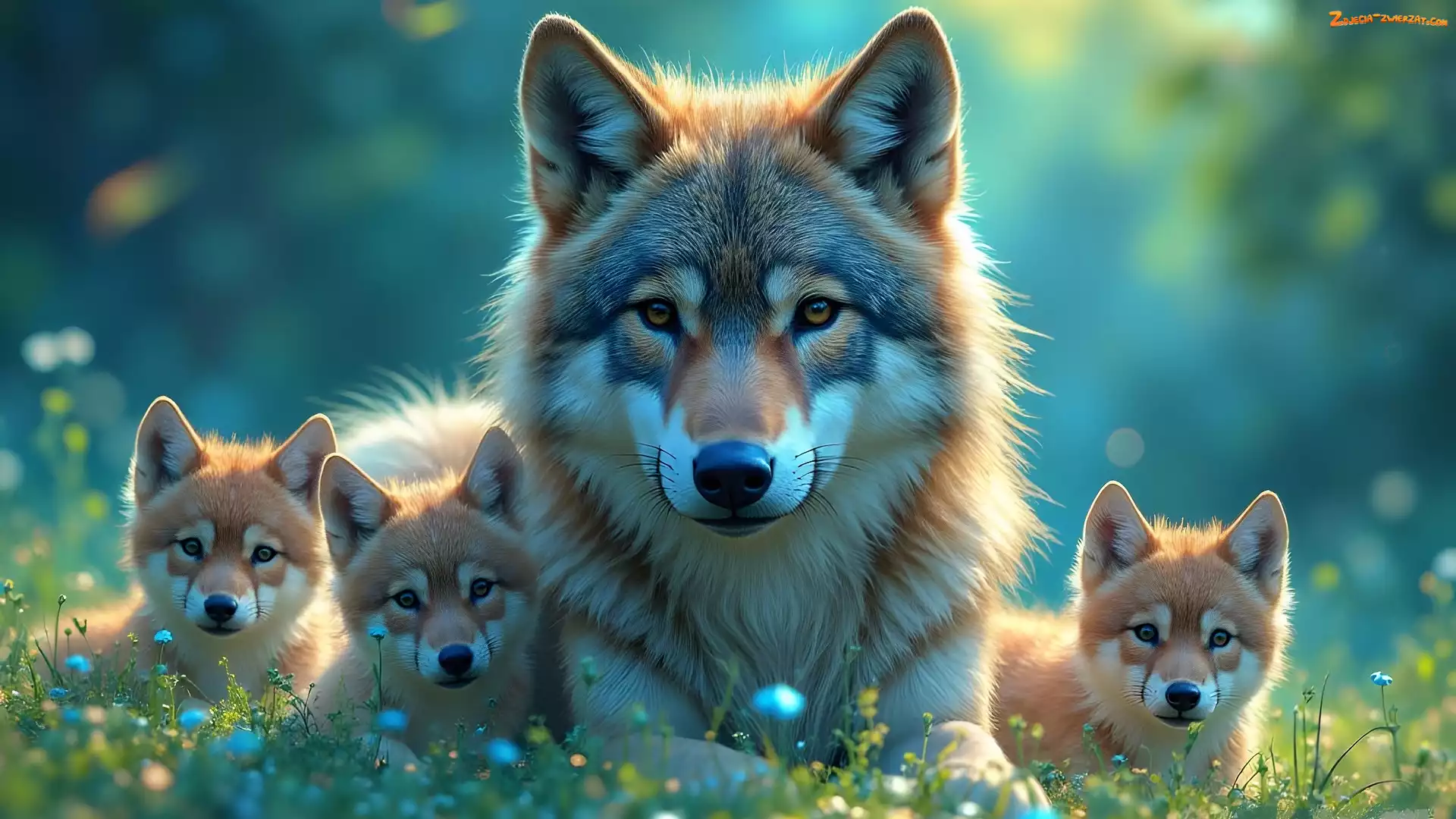 Zdjęcie: Młode, Grafika, Leżący, Trzy, Kwiaty, Wilk, Wilki