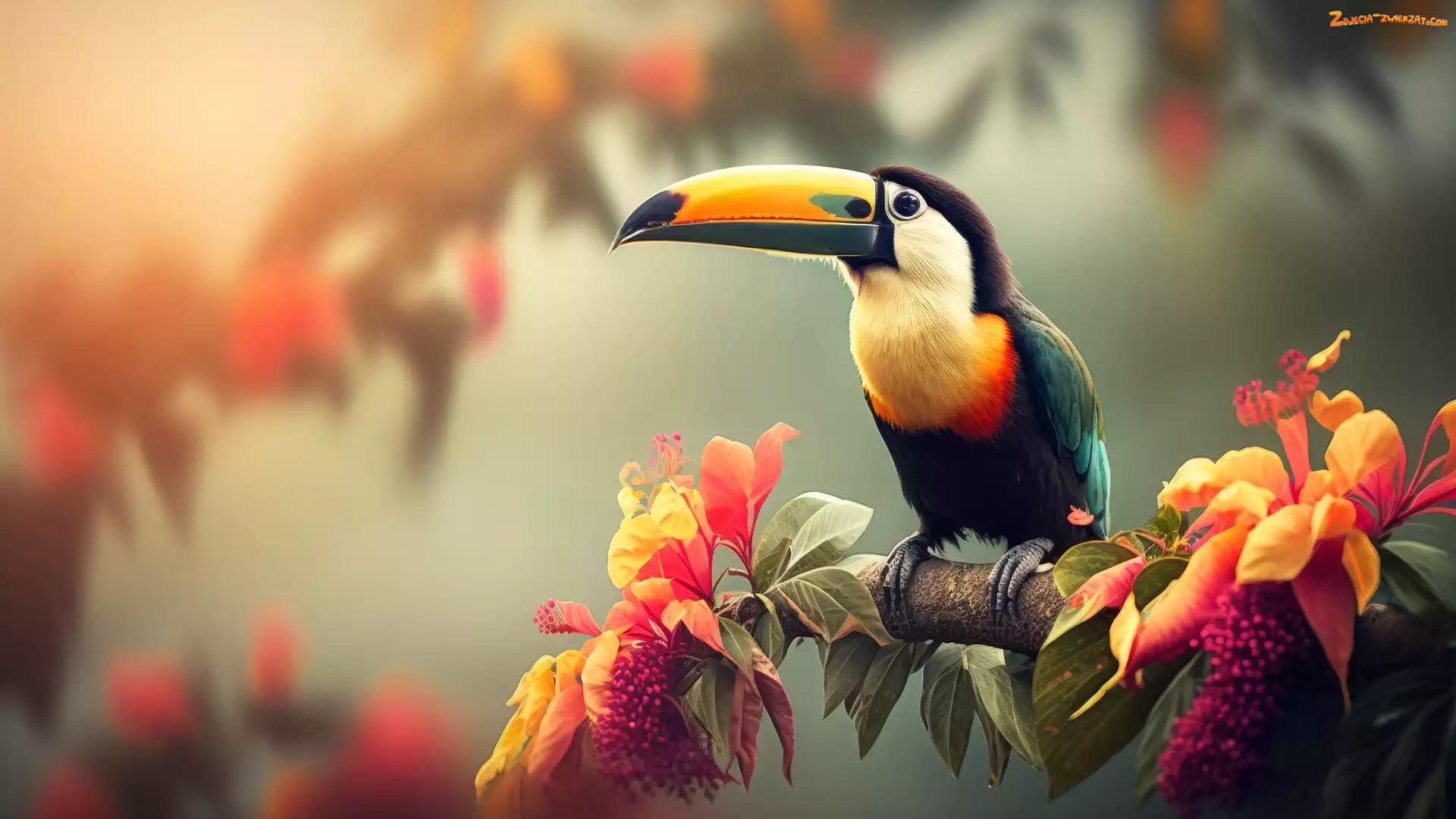 Zdjęcie: Gałąź, Tukan, Kwiaty, Kolorowy, Ptak