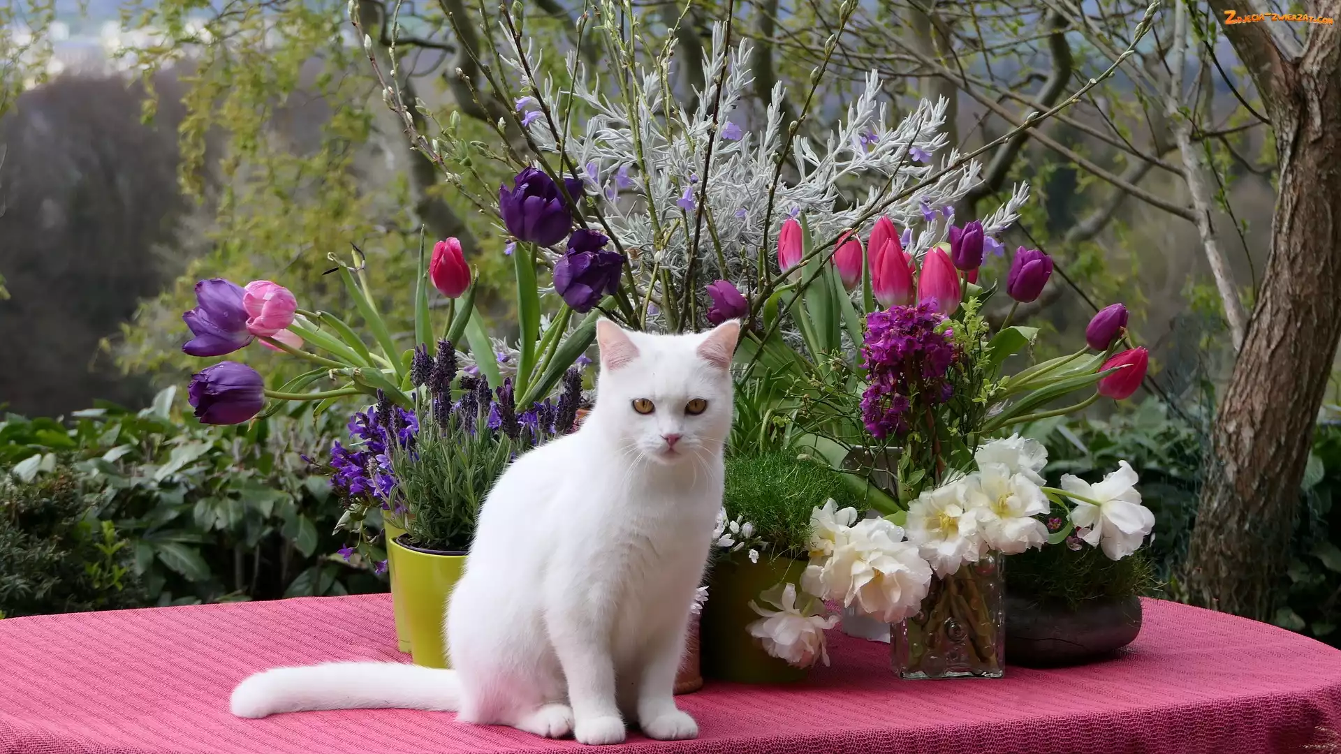 Zdjęcie: Obrus, Kwiaty, Biały, Różowy, Gałązki, Turecki van, Kot, Tulipany