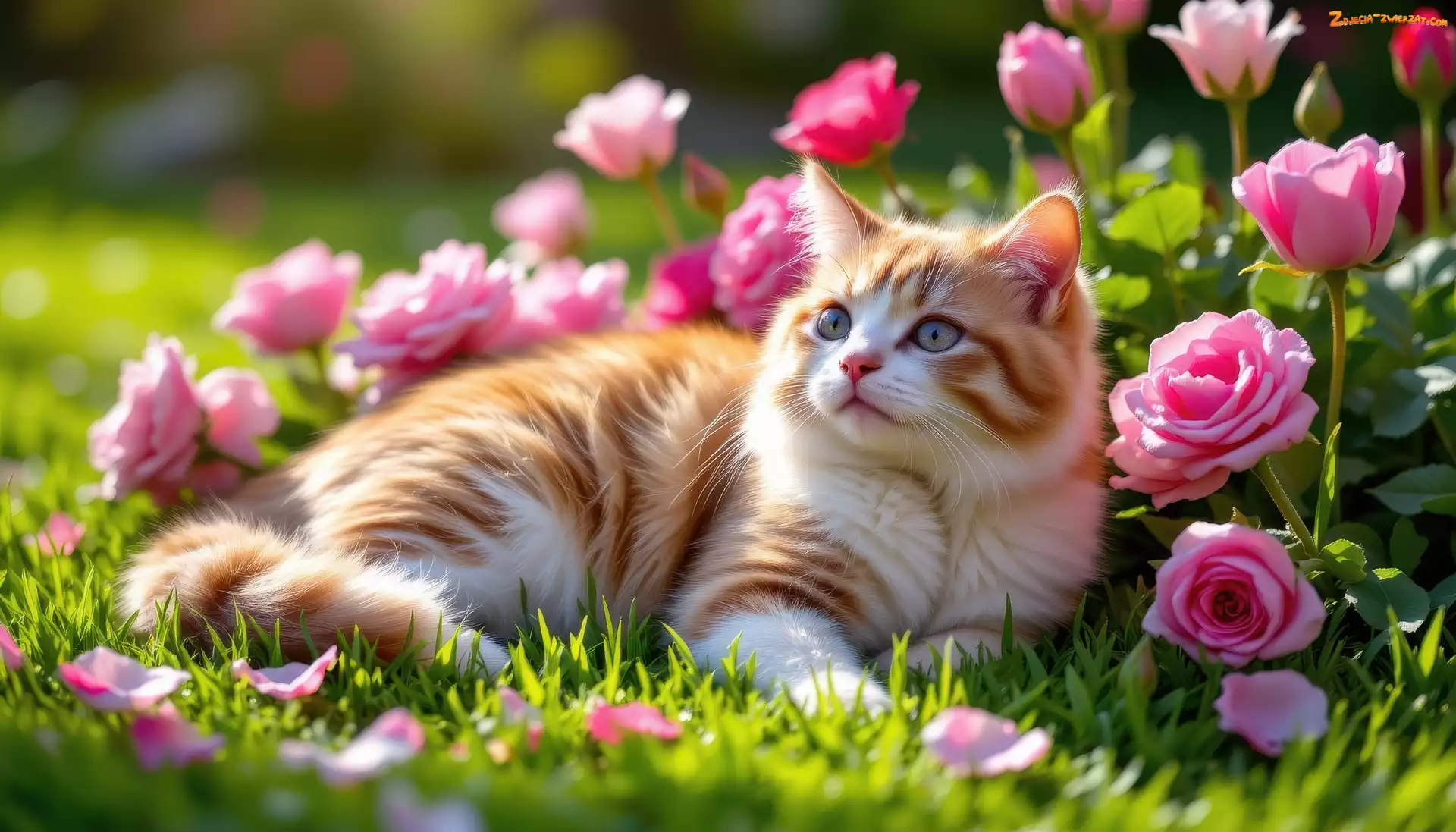 Zdjęcie: Róże, Rudo-biały, Kot, Kwiaty, AI, Różowe, Tulipany