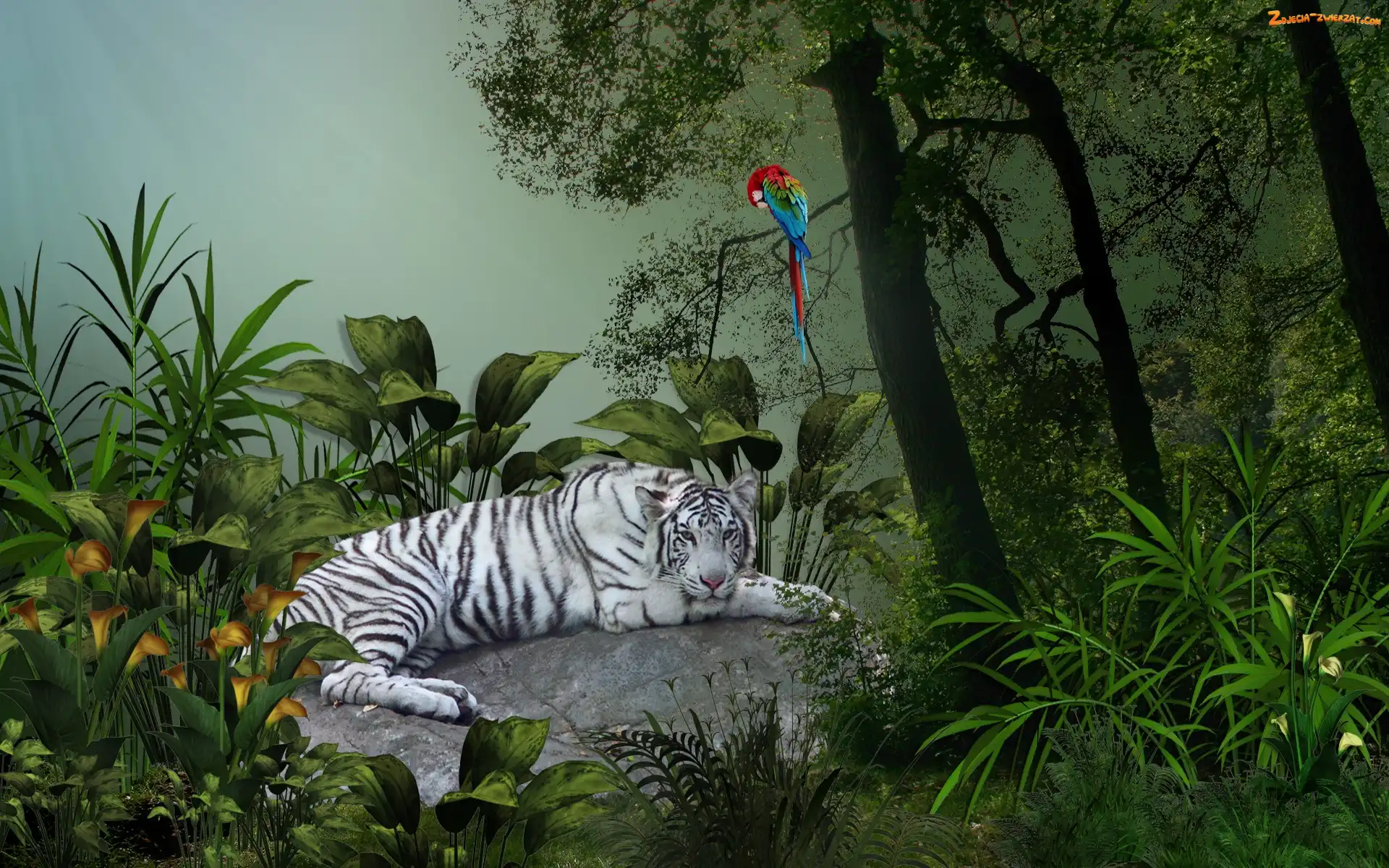 Zdjęcie: Tygrys, Papuga, Biały, Kamień